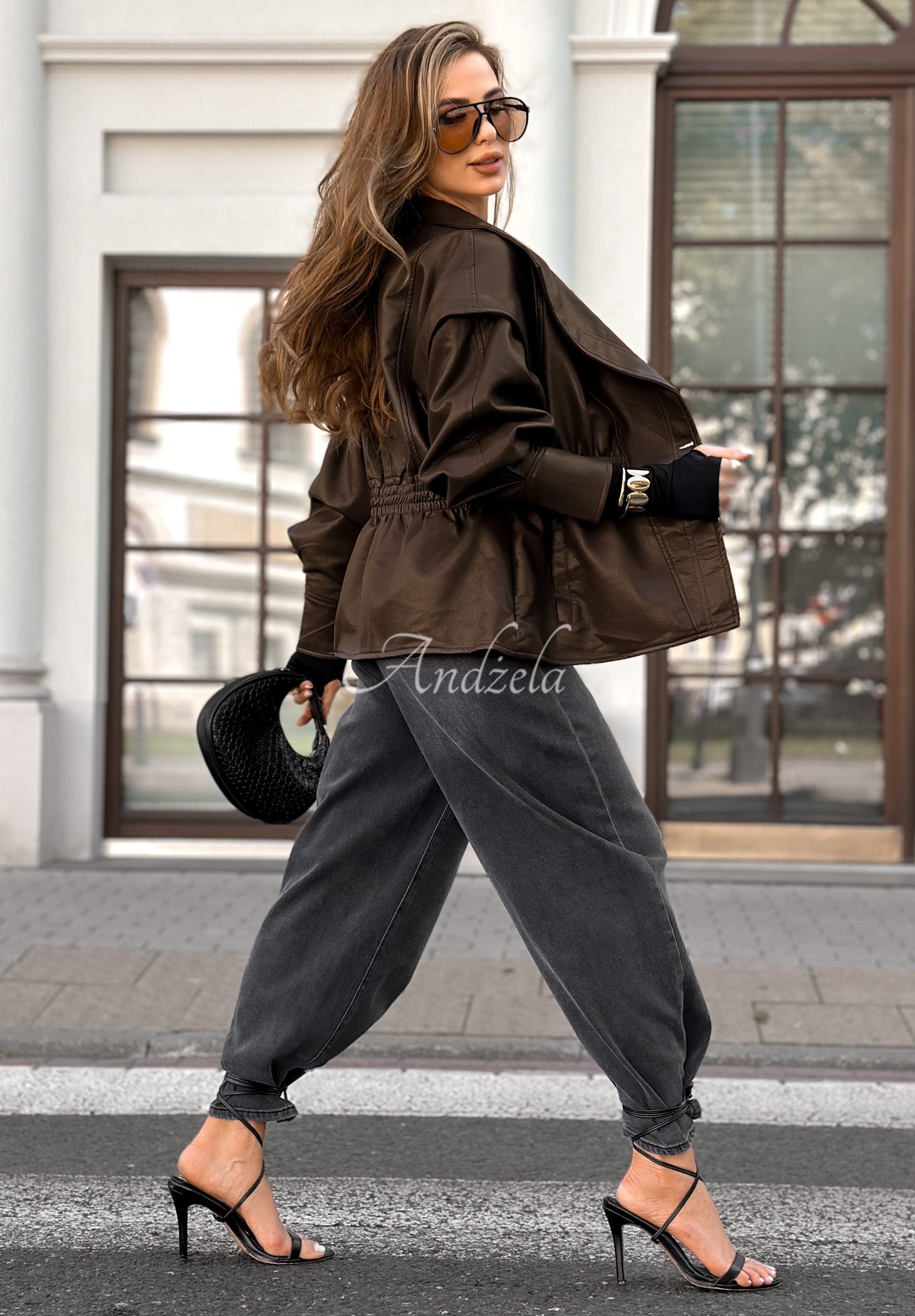 Bunda v kratším střihu, vyrobená z koženého materiálu. Vyznačuje se projmutým střihem a elastickou gumou v pase. Model s límečkem, zapínaný na jeden knoflík. Vpředu se nacházejí funkční kapsy a dlouhé rukávy jsou zakončeny manžetami.