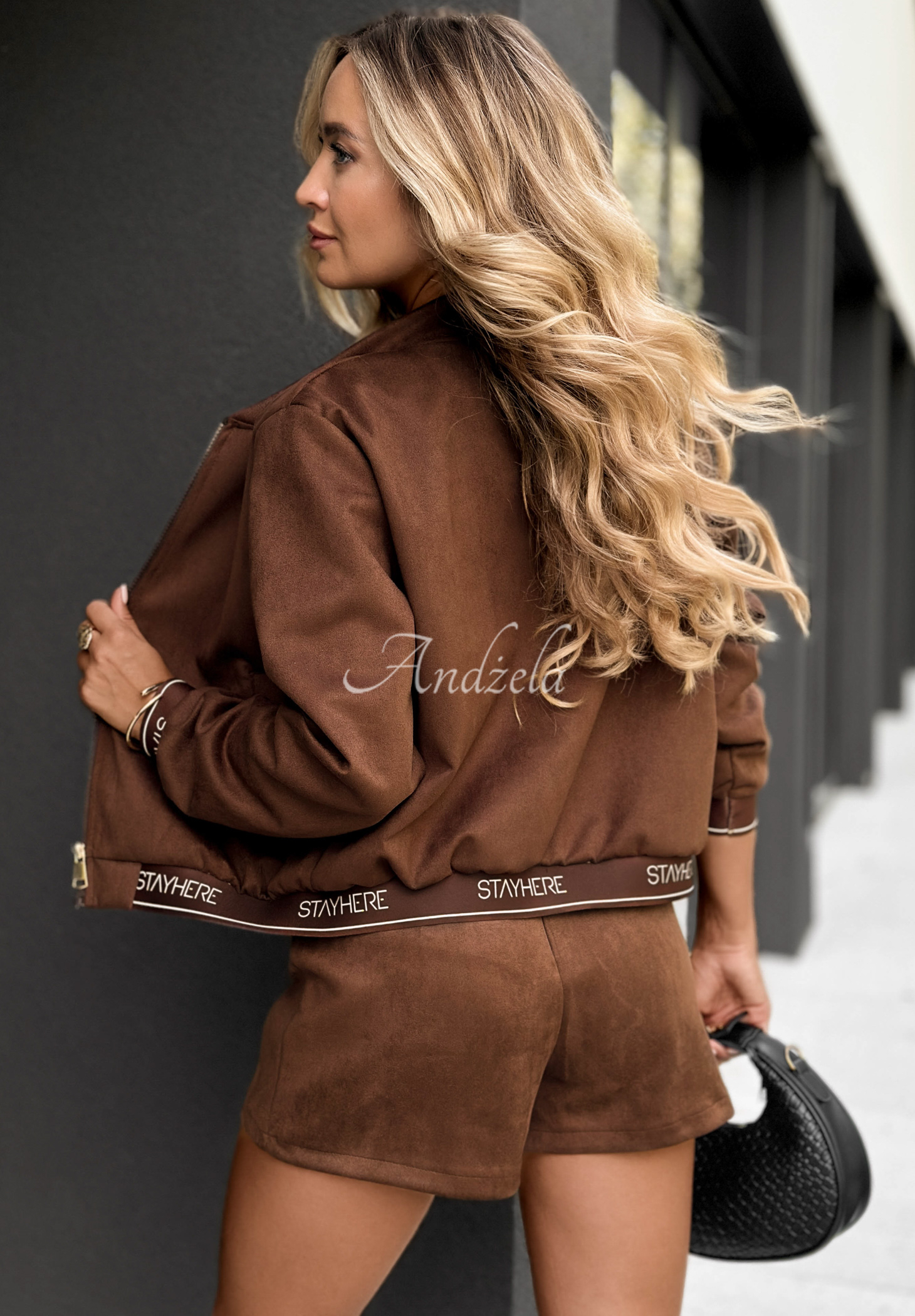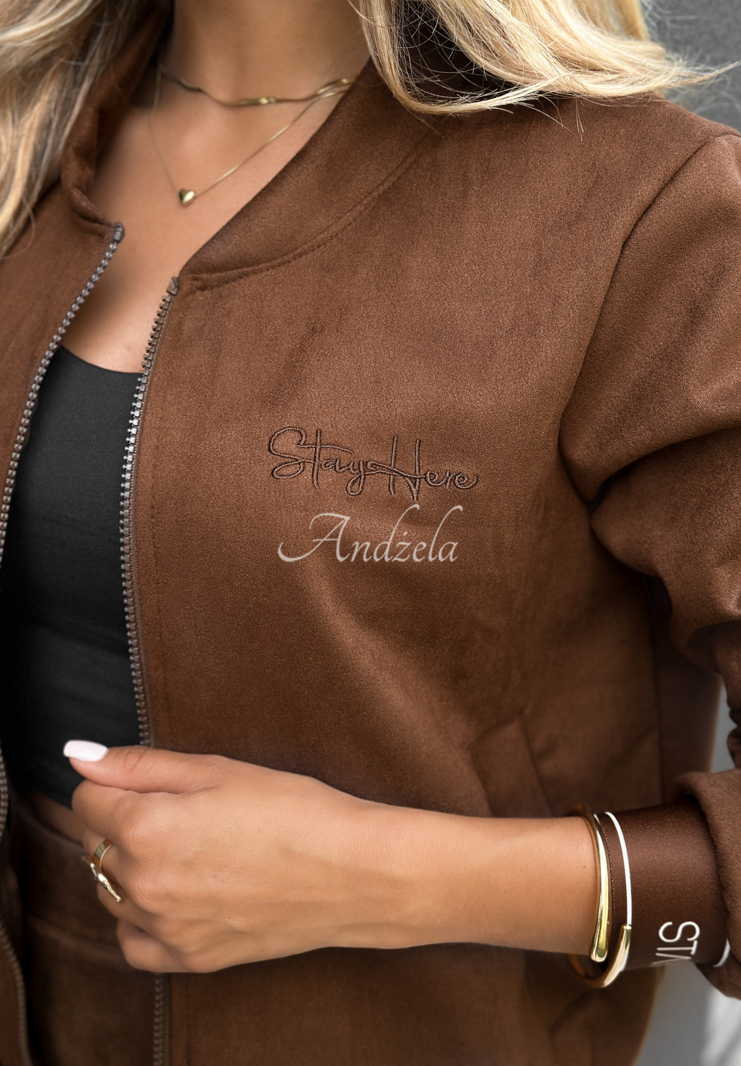 Mikina ve střihu bomberky vyrobená z imitace semišového materiálu. Model s kratším střihem, zapínaný na zip. V dolní části má elastickou gumičku s nápisy a decentní výšivku. Vpředu se nachází funkční kapsy.