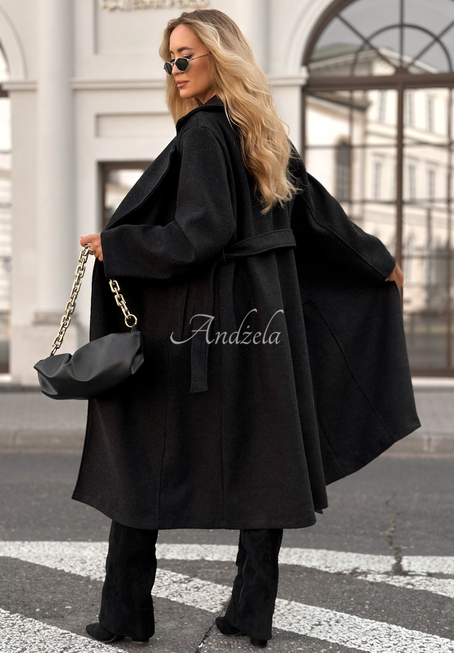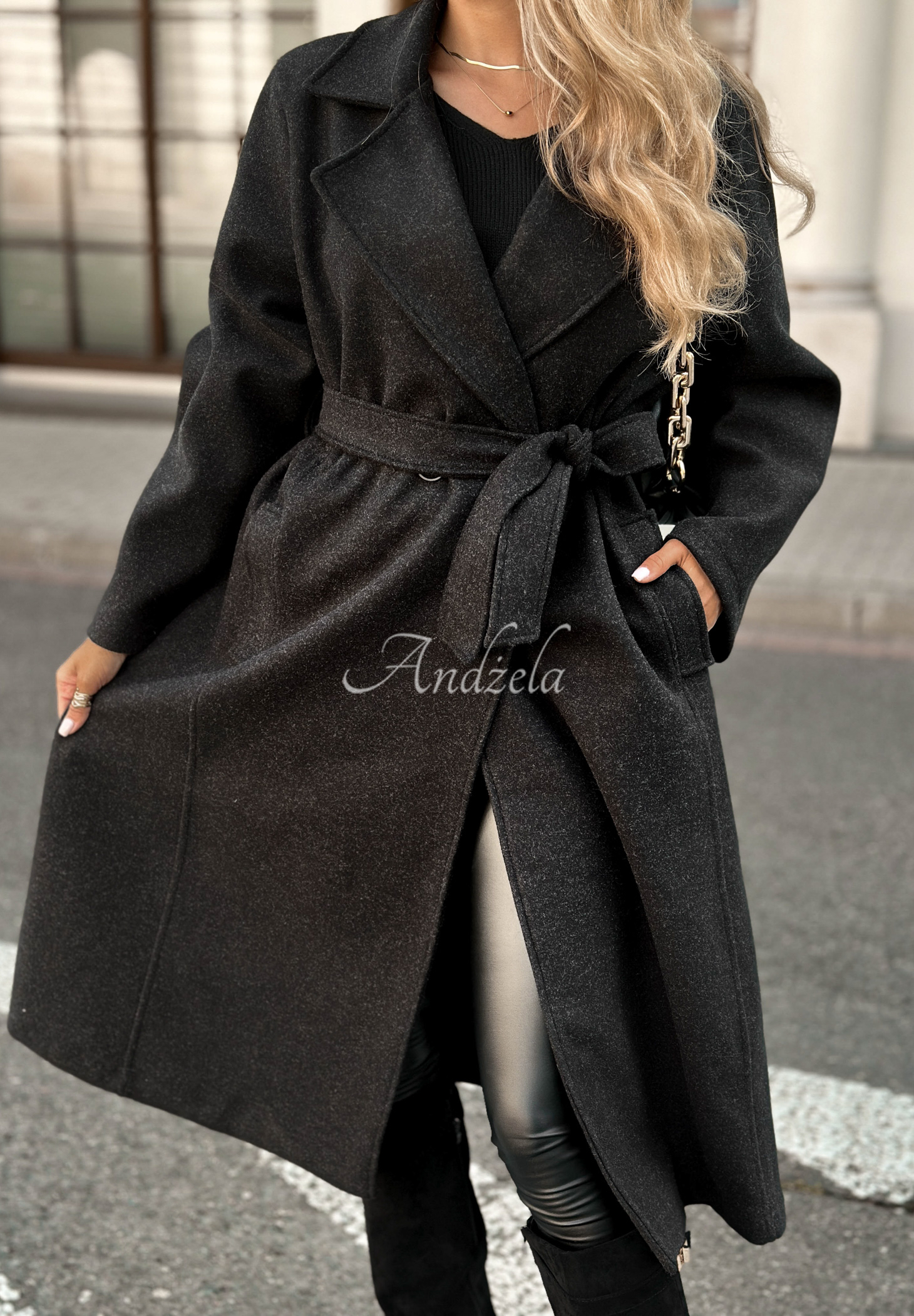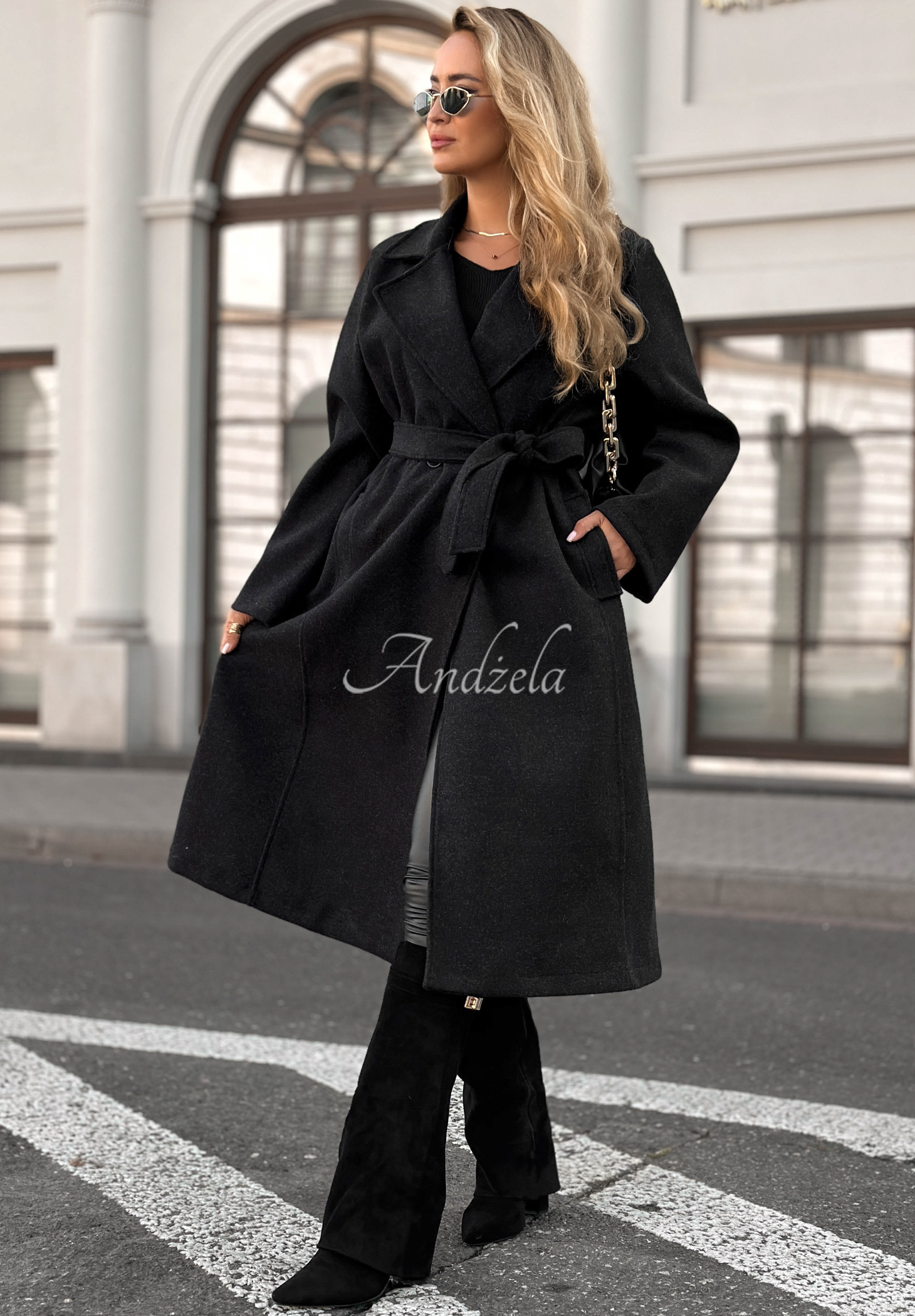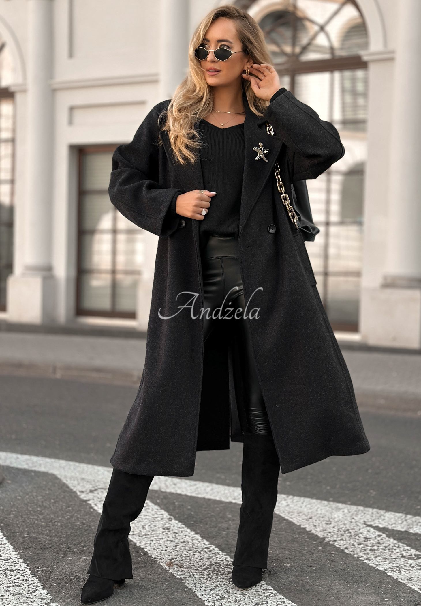 Kabát z příjemného na dotek materiálu s příměsí viskózy. Model s delším střihem a límečkem. Vpředu má funkční kapsy a zapínání na knoflíky. Celkový vzhled doplňuje látkový pásek a brož přiložené k soupravě.