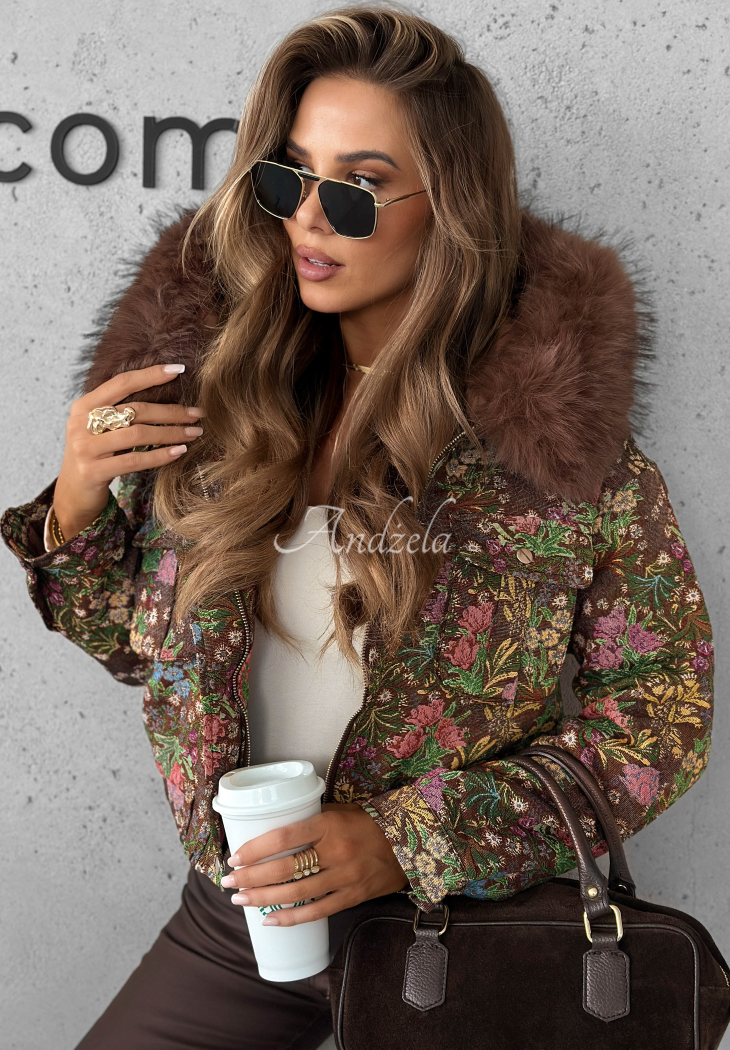 Žakárová bunda s květy s kožíškem Frosted Flowers čokoládová