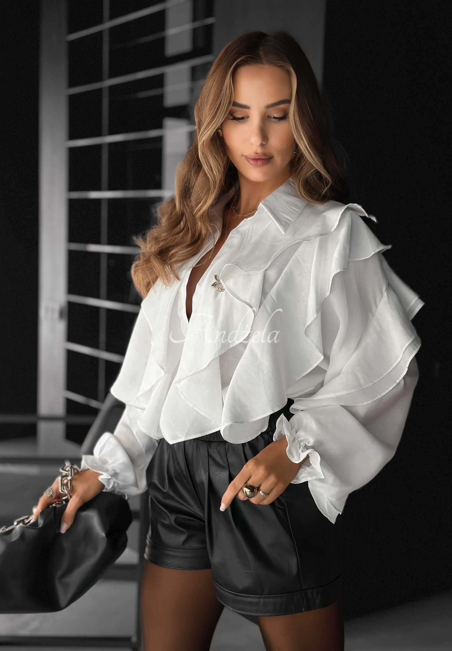Lehká košile z viskózy s příměsí bavlny. Vyznačuje se množstvím volánků a širokými rukávy zakončenými manžetami. Model v klasickém střihu s límečkem a zapínáním na knoflíky.
