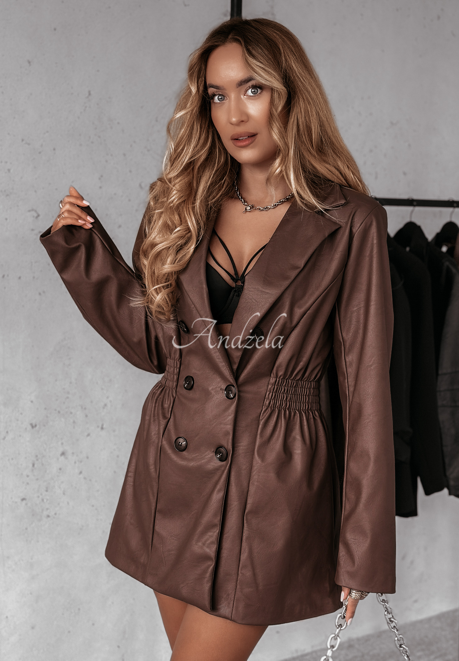 Kožené sako delšího střihu, zapínané vpředu na knoflíky. Má vycpávky v ramenou a gumu v pase.