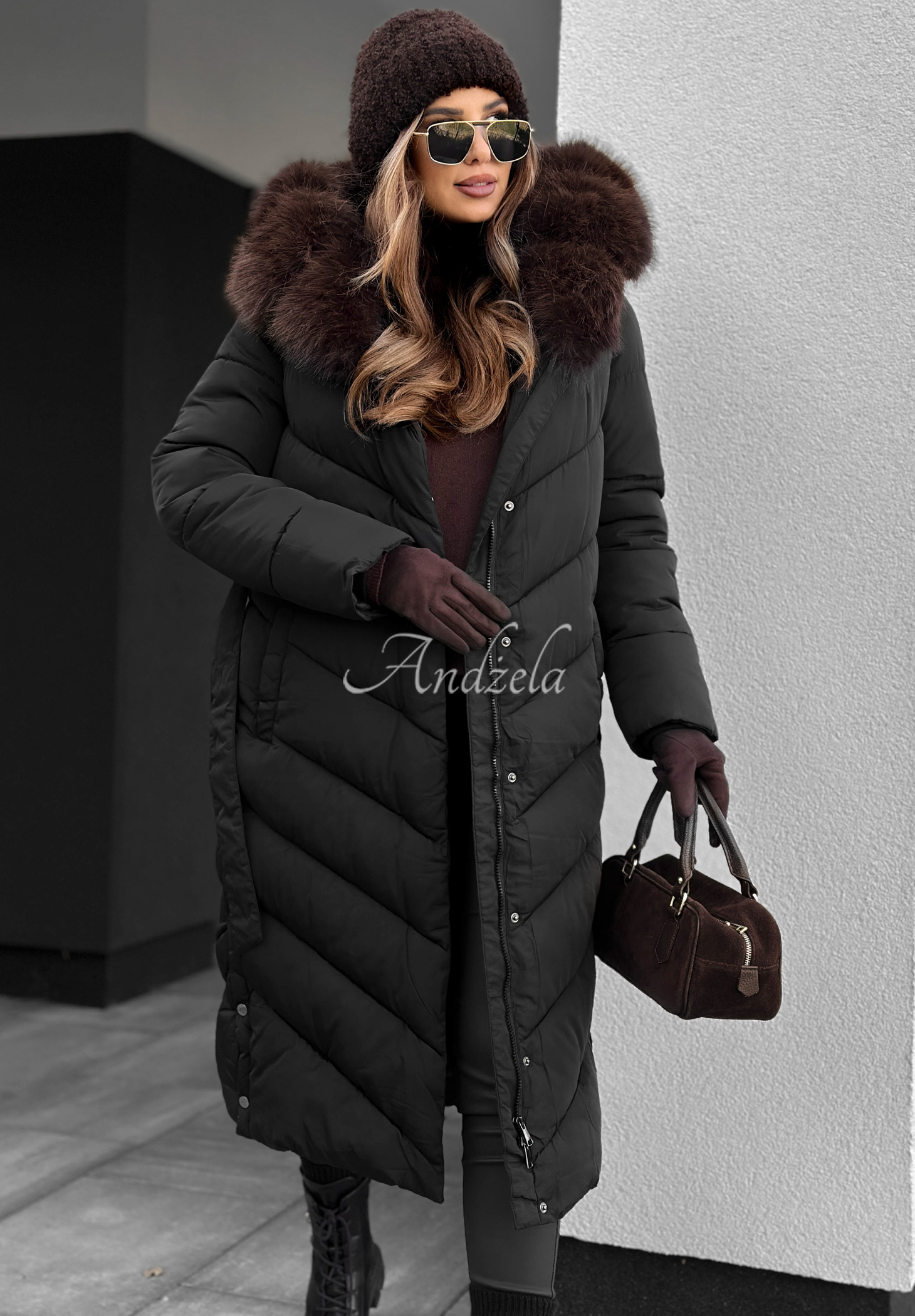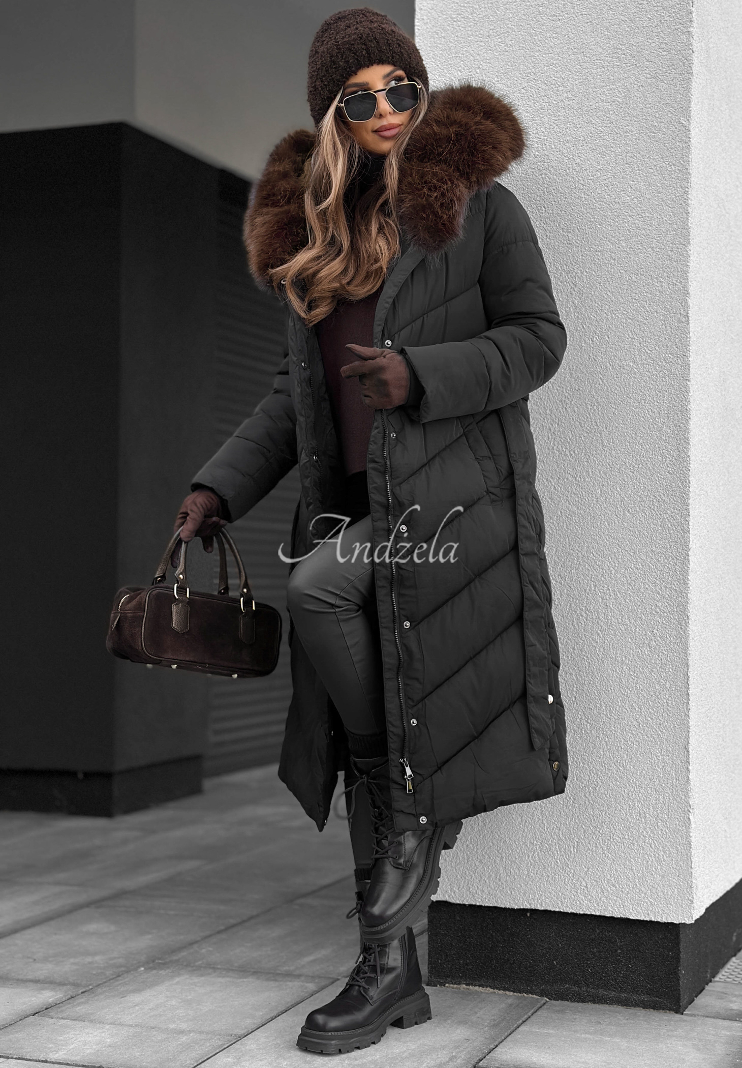 Dlouhá prošívaná bunda zateplená syntetickým peřím. Model s kapucí, zapínaný na zip a druky. Má přední kapsy a dlouhé rukávy zakončené žebrovanými náplety.