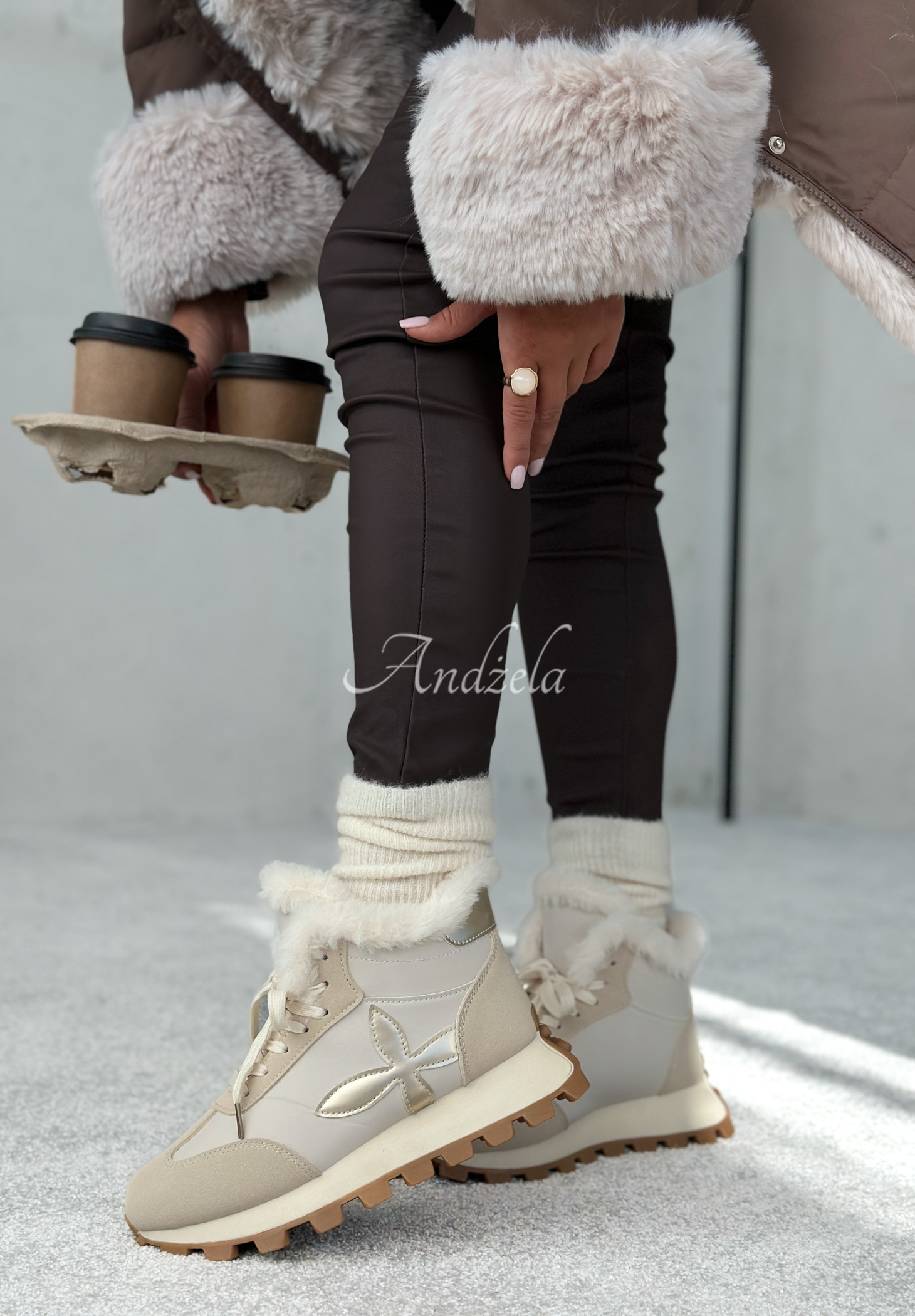 Sneakersy na zvýšené podrážce s kulatou špičkou. Šněrovací model s vrškem nad kotník, zateplený syntetickou kožešinou.