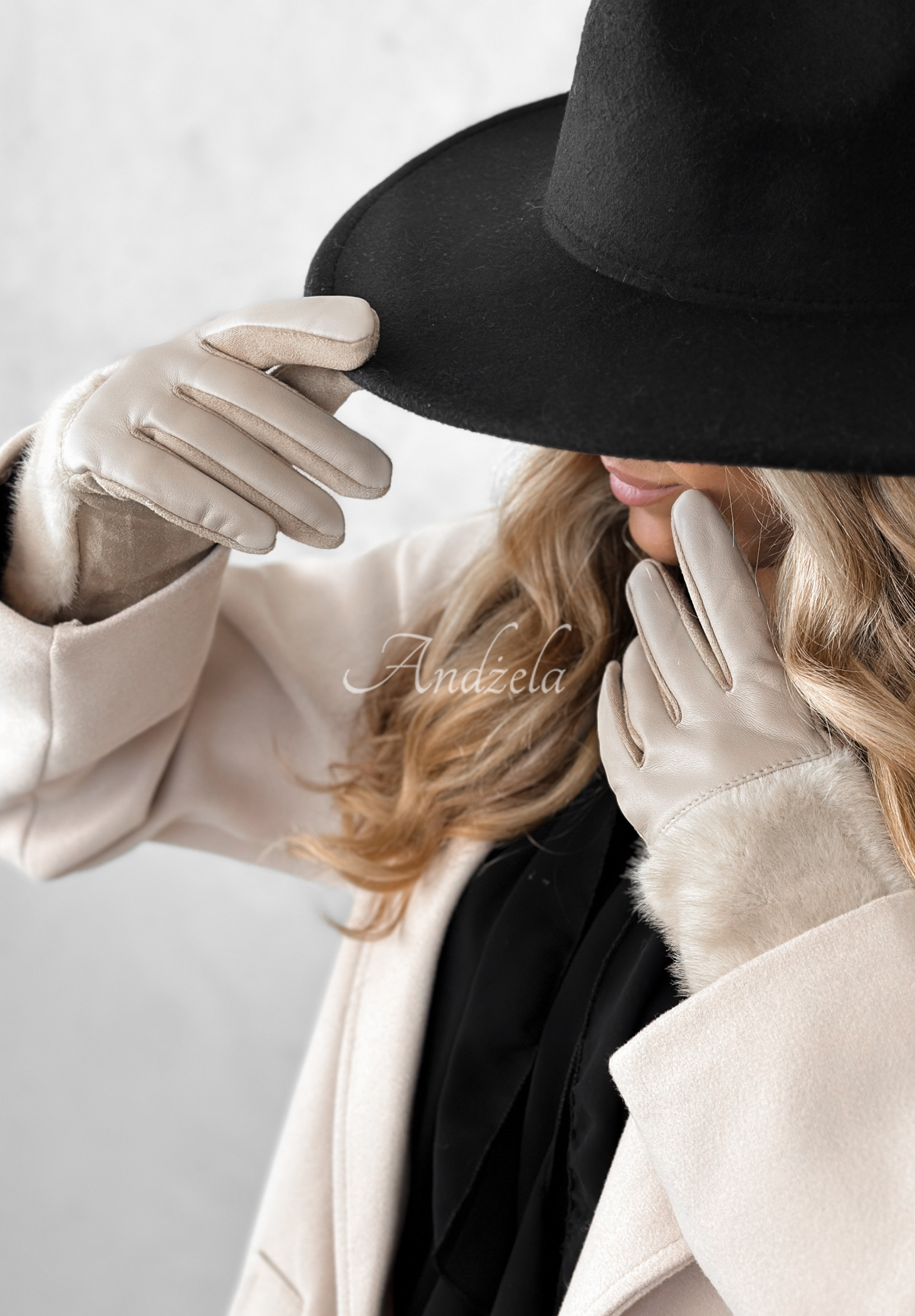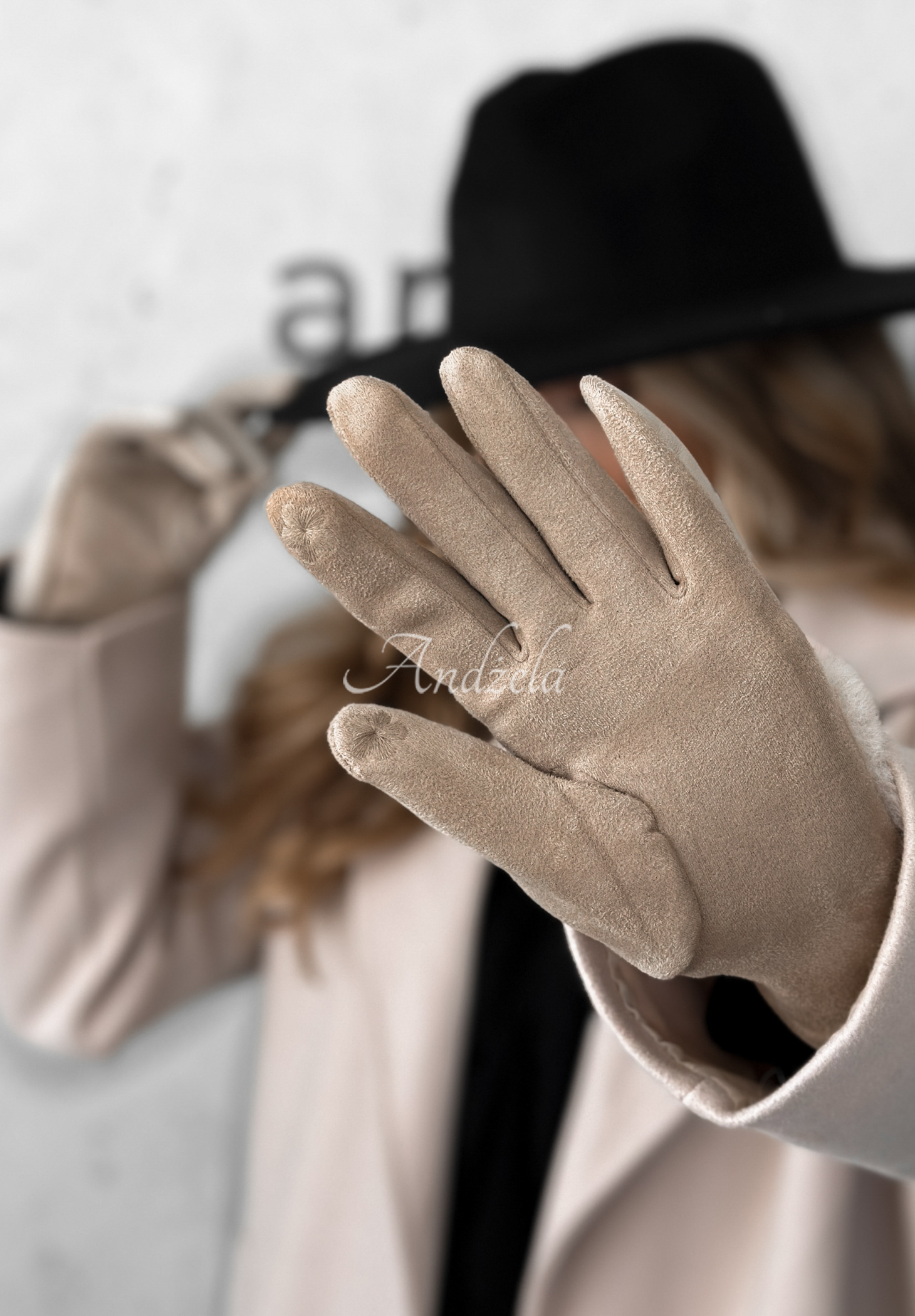 Rukavice z imitace kůže a semiše. Uvnitř jsou lehce zateplené. U zápěstí je ozdobný syntetický kožíšek a zlatý detail. Ukazováček a palec jsou vybaveny speciálními aplikacemi, které umožňují pohodlné používání telefonu.