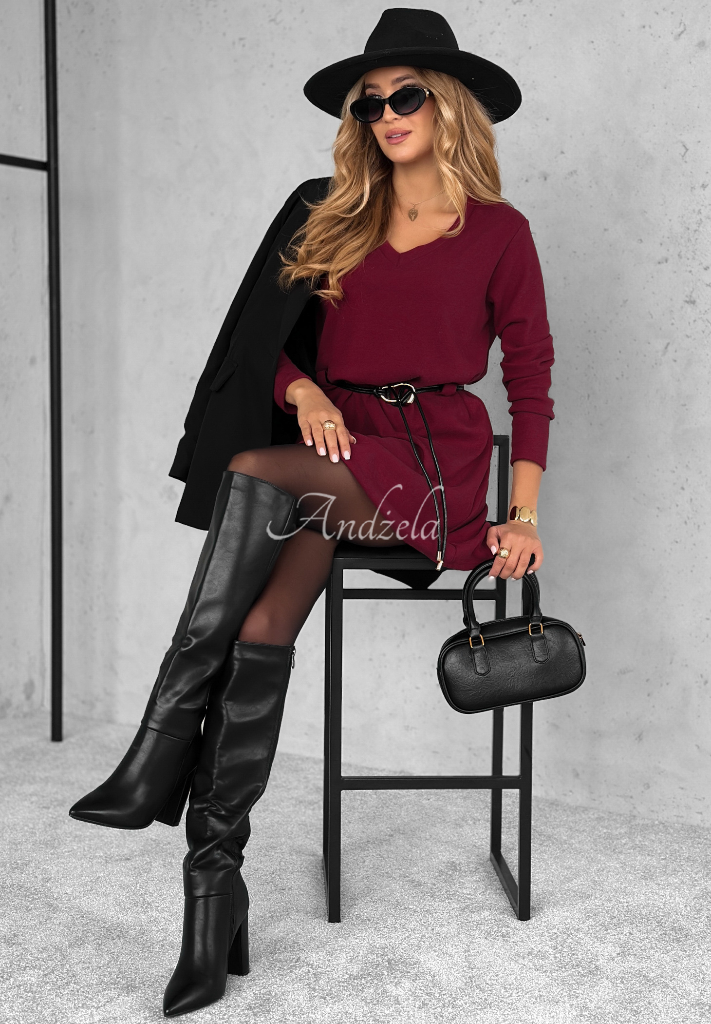 Šaty z úpletového materiálu s příměsí viskózy. Model v mini délce s výstřihem do V a dlouhými rukávy. Součástí je pásek se zlatým detailem.