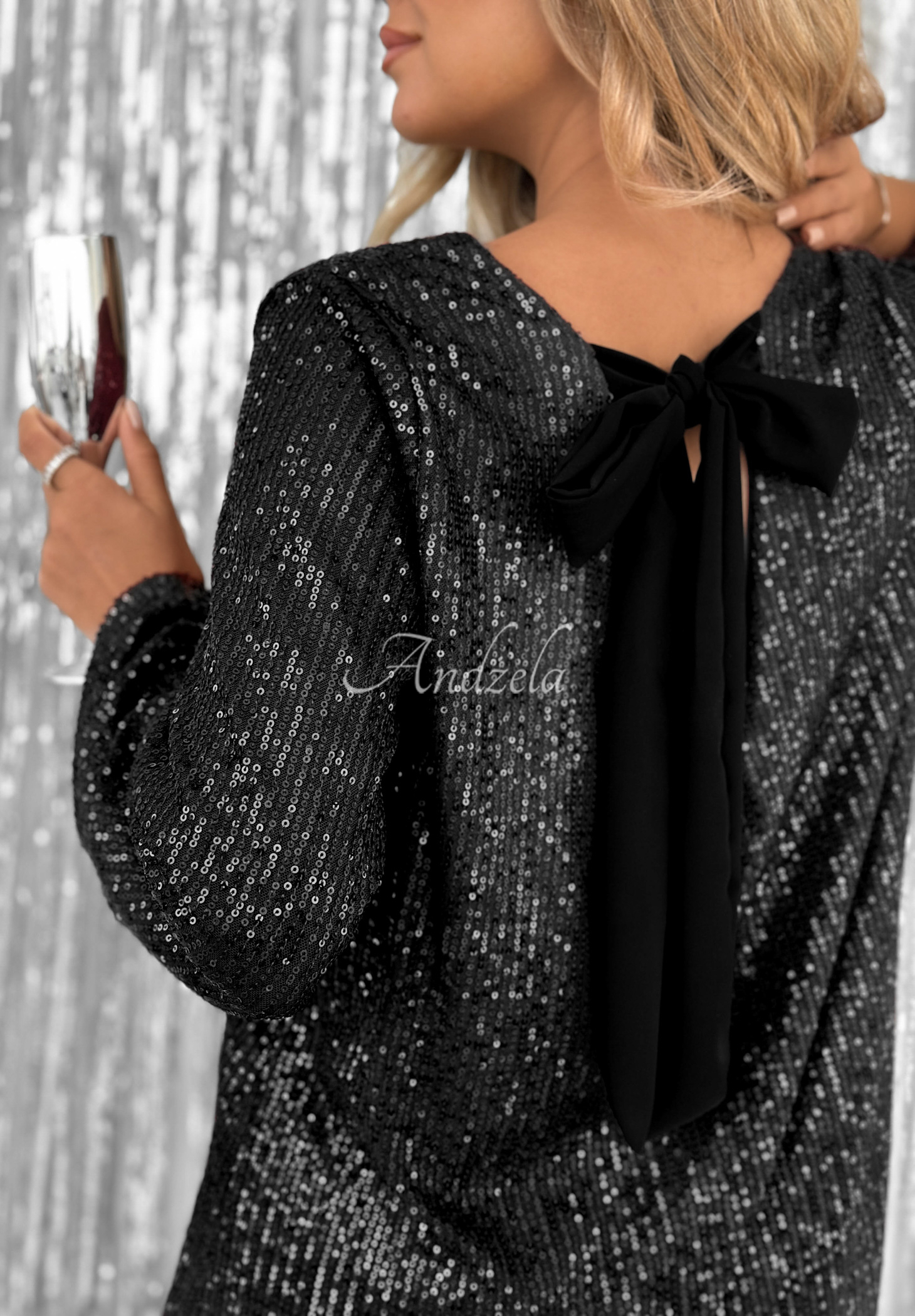 Výjimečné mini šaty celé pokryté třpytivými flitry. Jejich dalším předností je zavazování na zádech. Model s kulatým výstřihem a dlouhými rukávy.