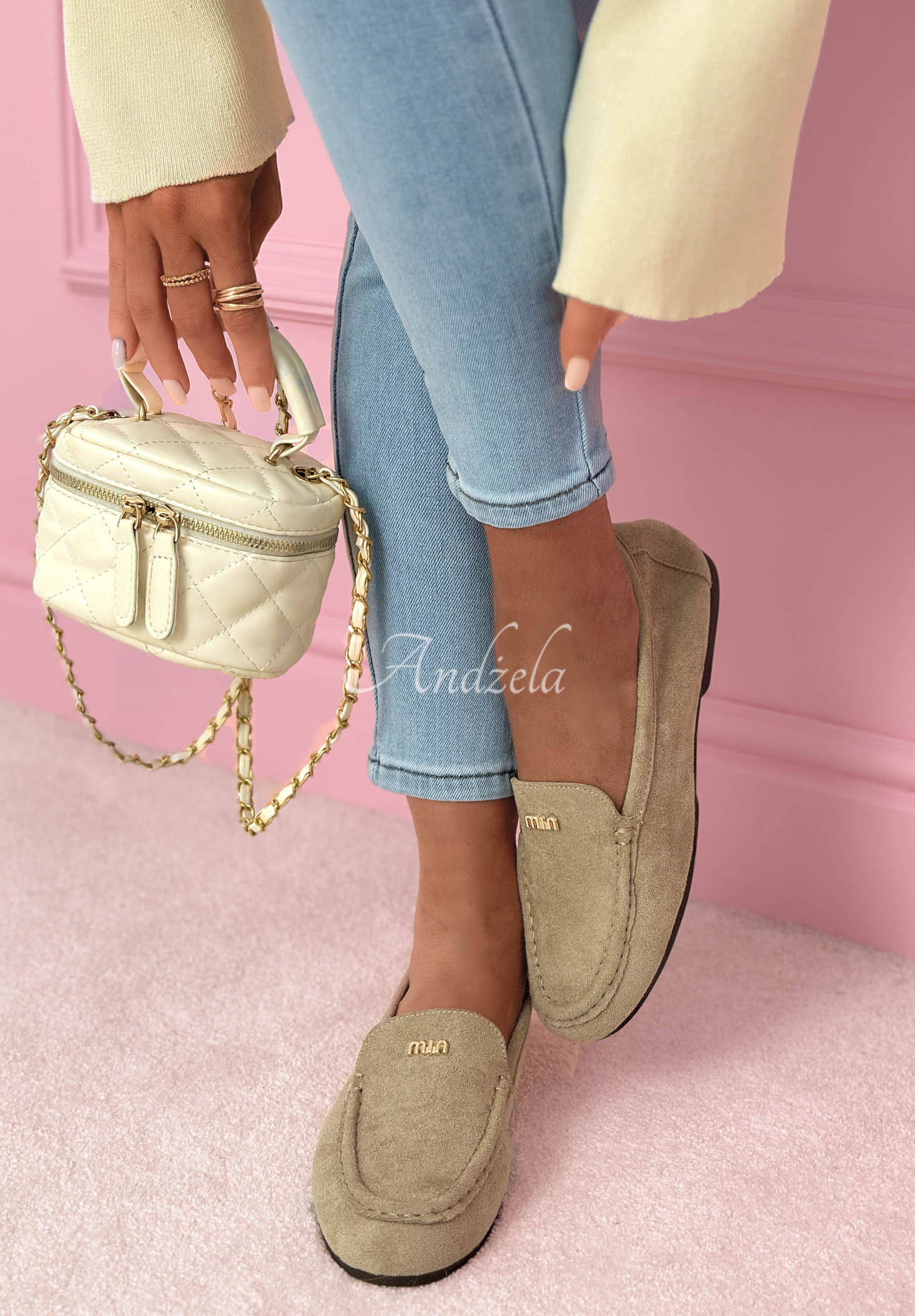 Semišové mokasíny na ploché gumové podrážce. Jedná se o model se zaoblenou špičkou, který se vyznačuje zlatým detailem na přední straně. Mají stélku vyrobenou z pravé kůže.