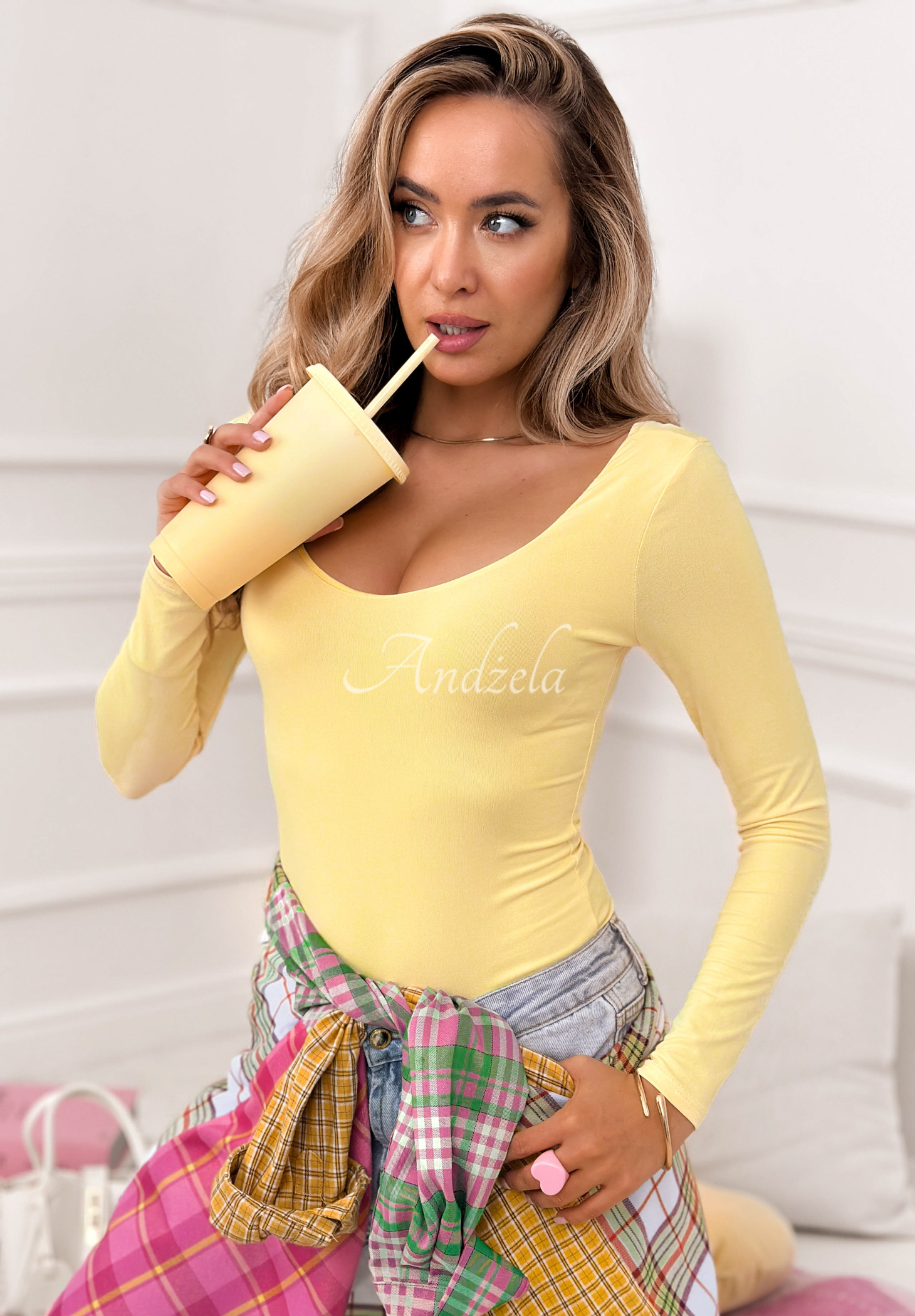 Body vyrobené z elastického materiálu, který se skvěle přizpůsobuje postavě. Vyznačuje se výstřihem vpředu a efektním výřezem na zádech. Jedná se o model se zapínáním na nastavitelné háčky, má dlouhé rukávy.