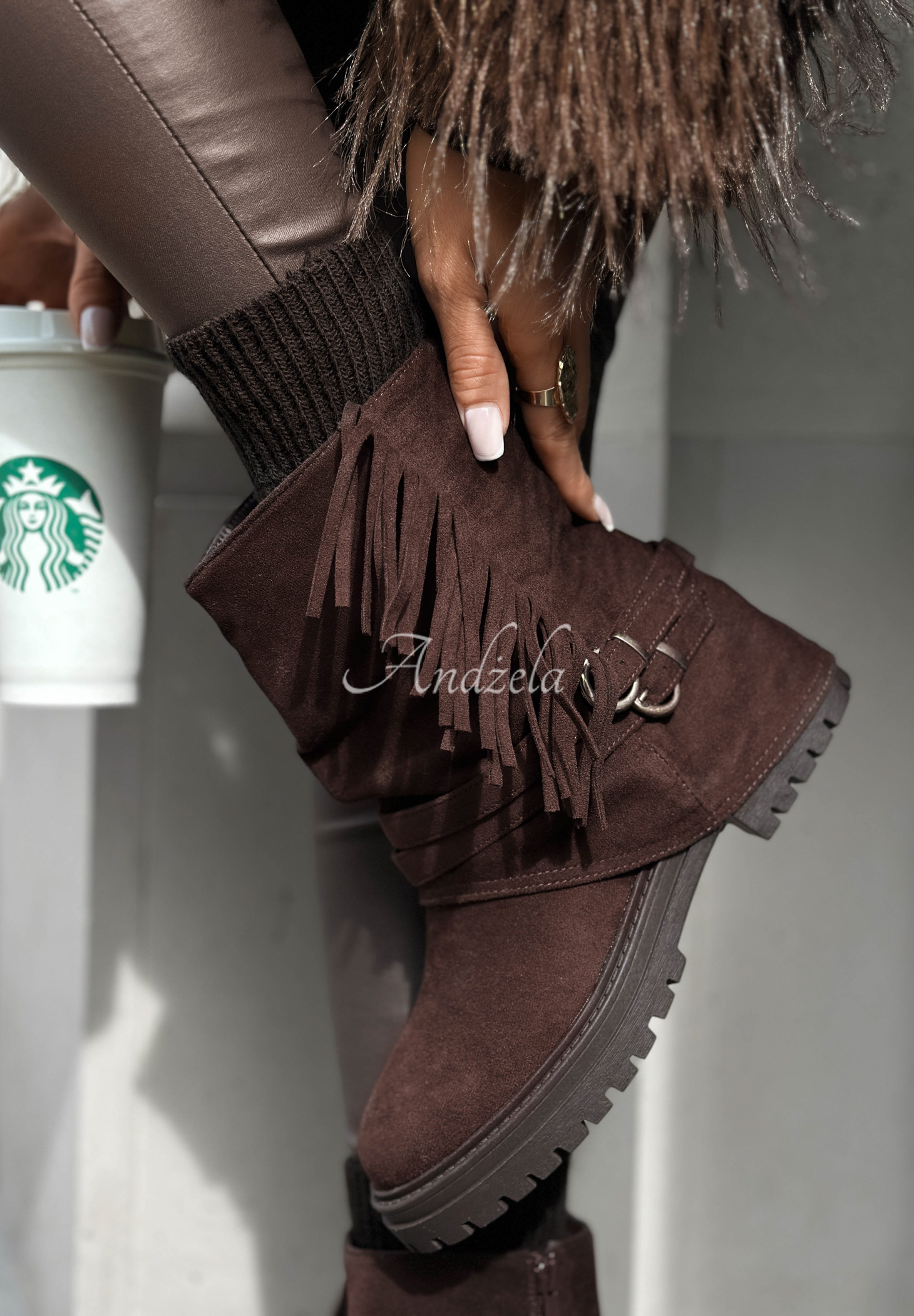 Kotníkové boty z imitace semiše jsou modelem, který se vyznačuje dodatečným materiálem s třásněmi a přezkami. Model má svršek nad kotník a kulatou špičku. Zapínání na zip se nachází z vnitřní strany.