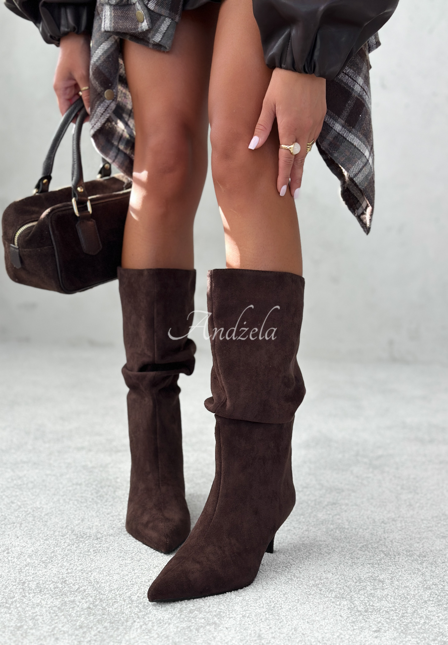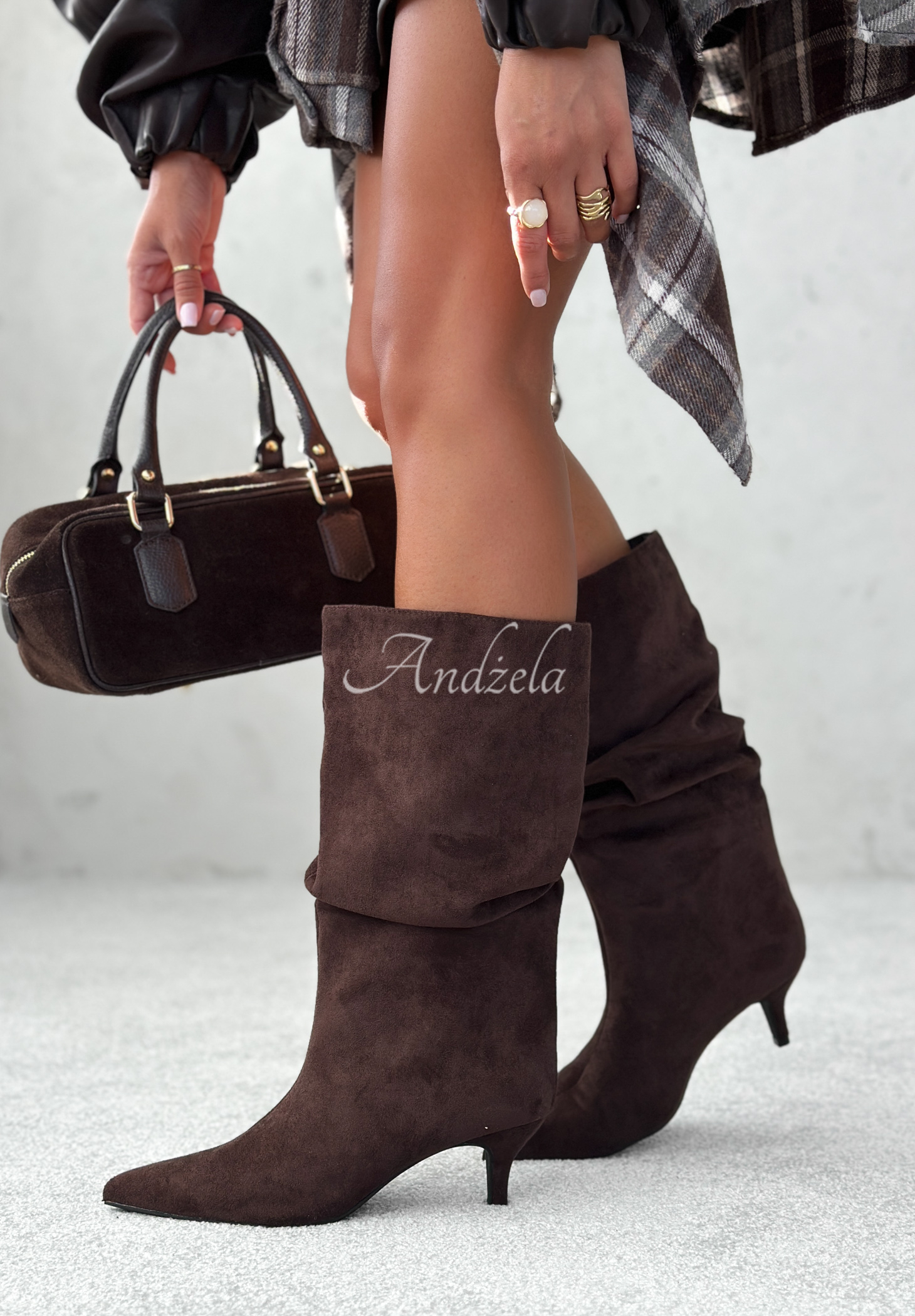 Krátké kozačky z příjemného materiálu imitujícího semiš. Model na nízkém, stabilním podpatku. Mají špičatou špičku a široký svršek.* imitace semiše* špičatá špička* široký svršek* nízký podpatek* lehce zateplené