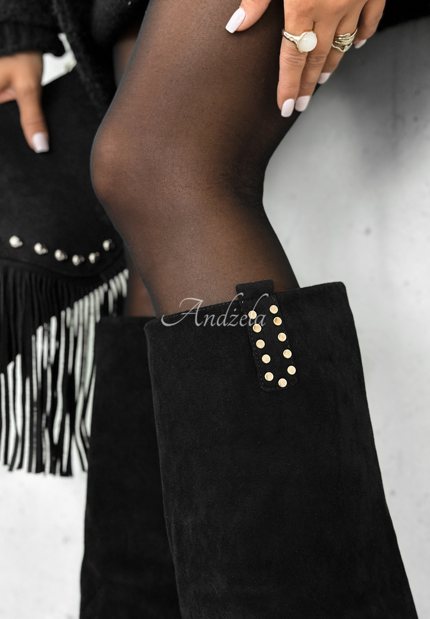 Dlouhé kozačky z imitace semiše posazené na vysokém stabilním podpatku. Model se zapínáním na zip z vnitřní strany, doplněný o přidaný materiál na vnější straně svršku. Boty zdobí jemné zlaté detaily.