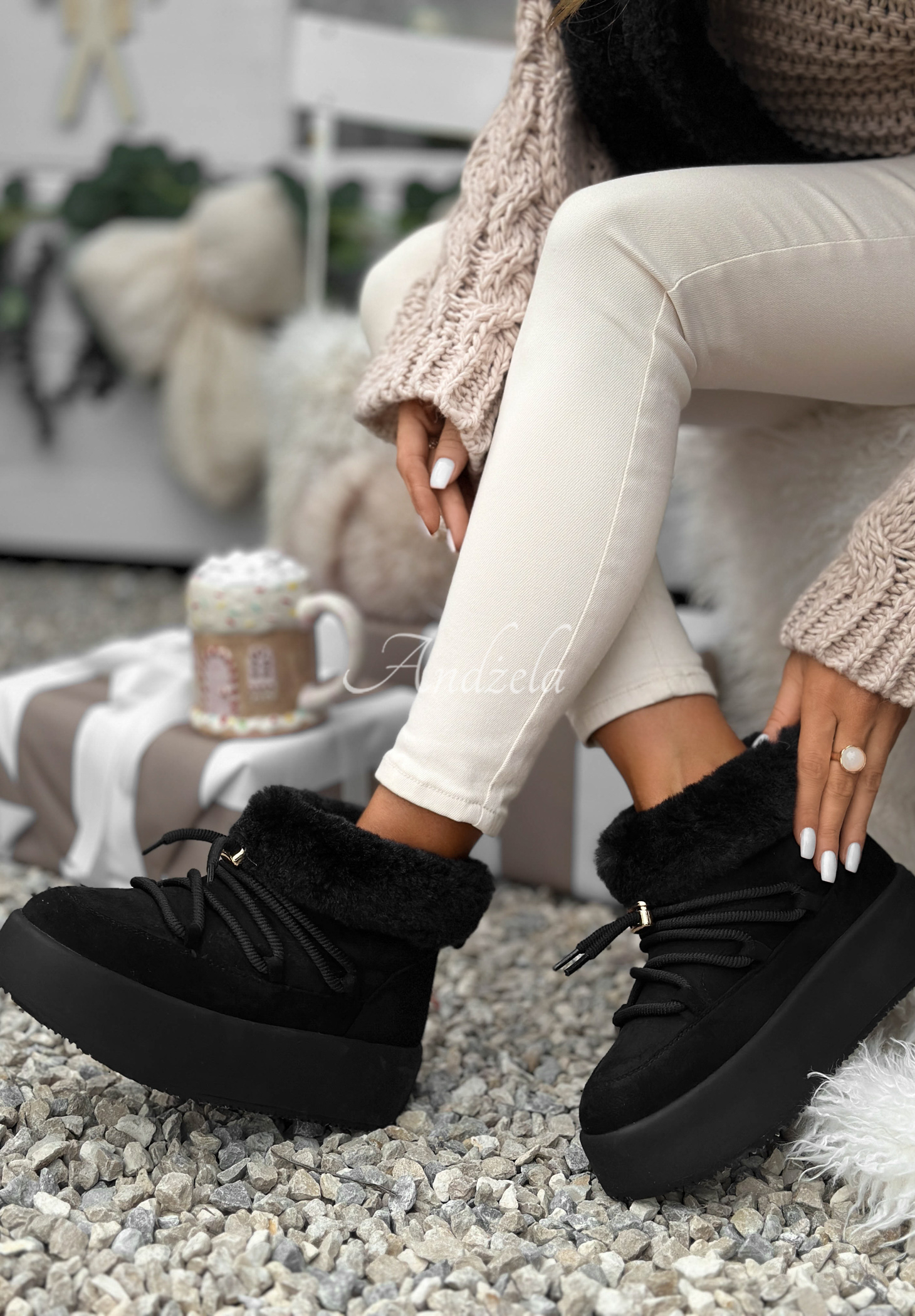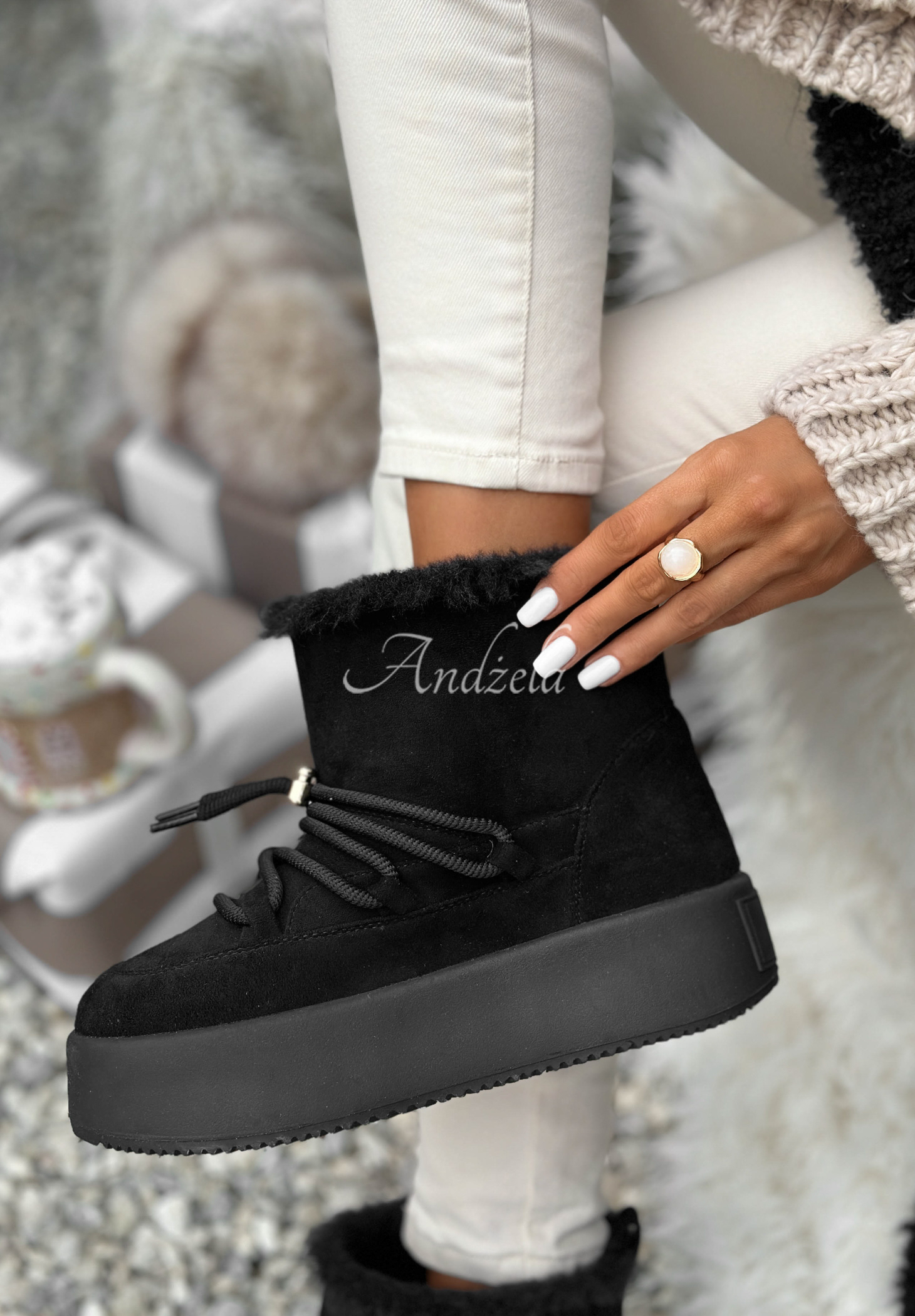 Zateplené sněhule vyrobené z materiálu imitujícího semiš. Šněrovací model je posazen na vysoké gumové podrážce se zaoblenou špičkou.* imitace semiše* zateplené syntetickou kožešinkou* masivní gumová podrážka* šněrovací* zaoblená špička