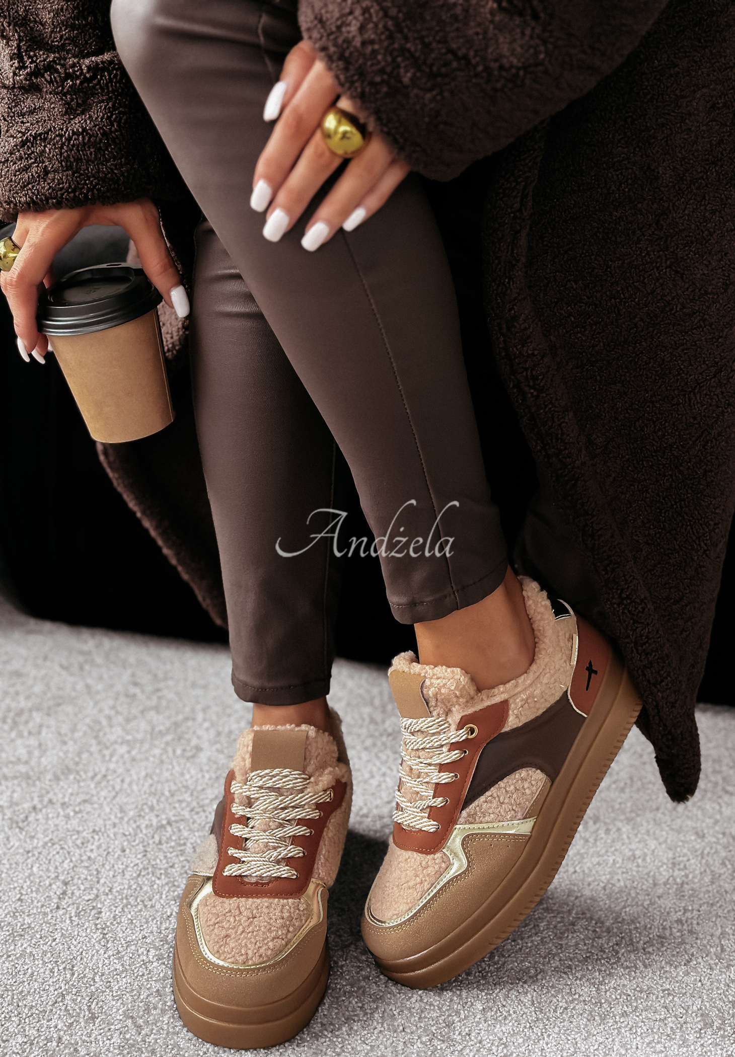 Zateplené tenisky s příjemným kožíškem uvnitř. Vynikají zlatými detaily a koženými prvky. Jedná se o šněrovací model se zaoblenou špičkou, posazený na vyšší gumové podrážce.