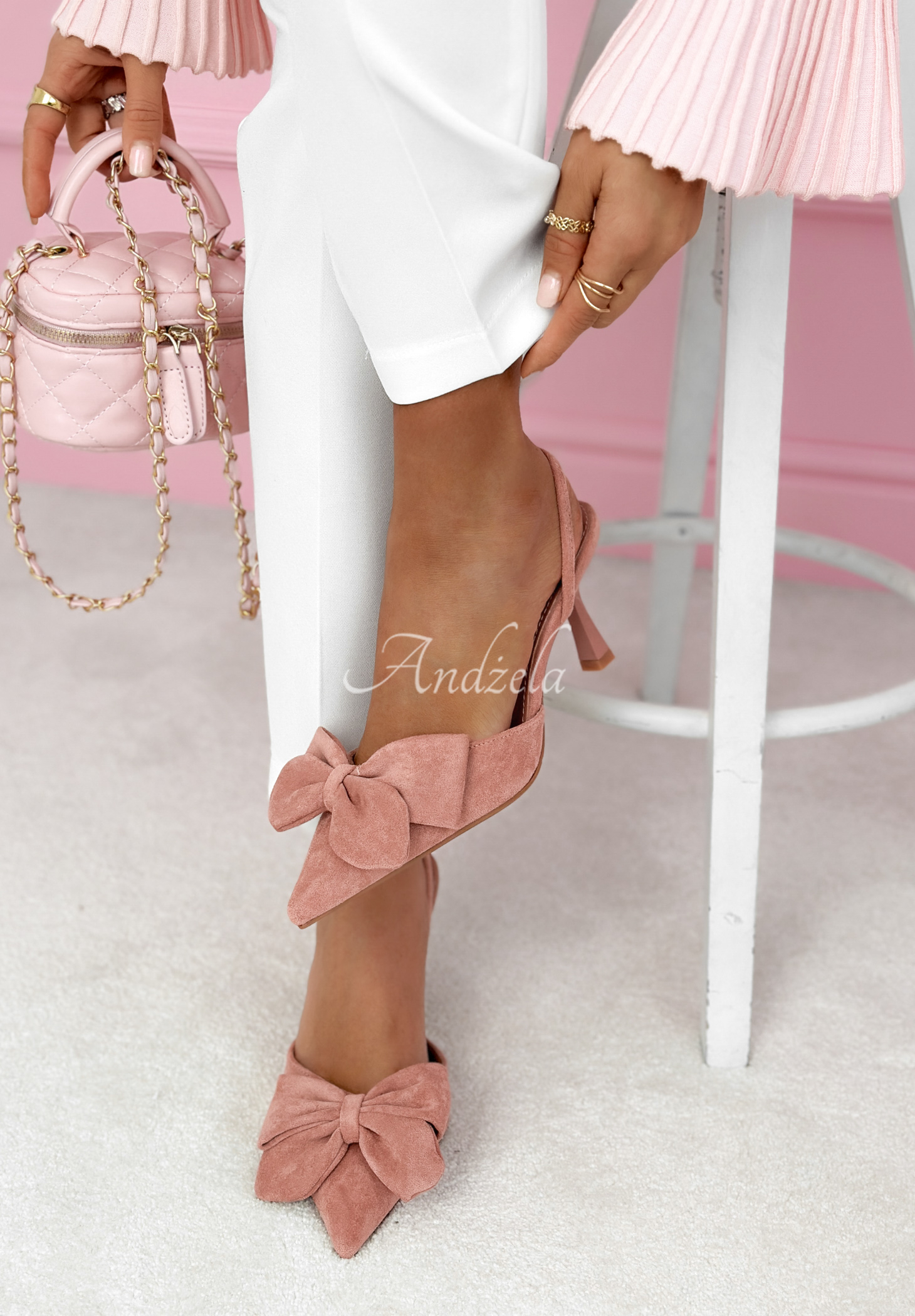 Sandálky s otevřenou patou na úzkém podpatku. Jedná se o model se špičatou špičkou, který vyniká ozdobnou mašličkou vpředu.* úzký podpatek* lehce elastický pásek* špičatá špička* mašlička* otevřená pata