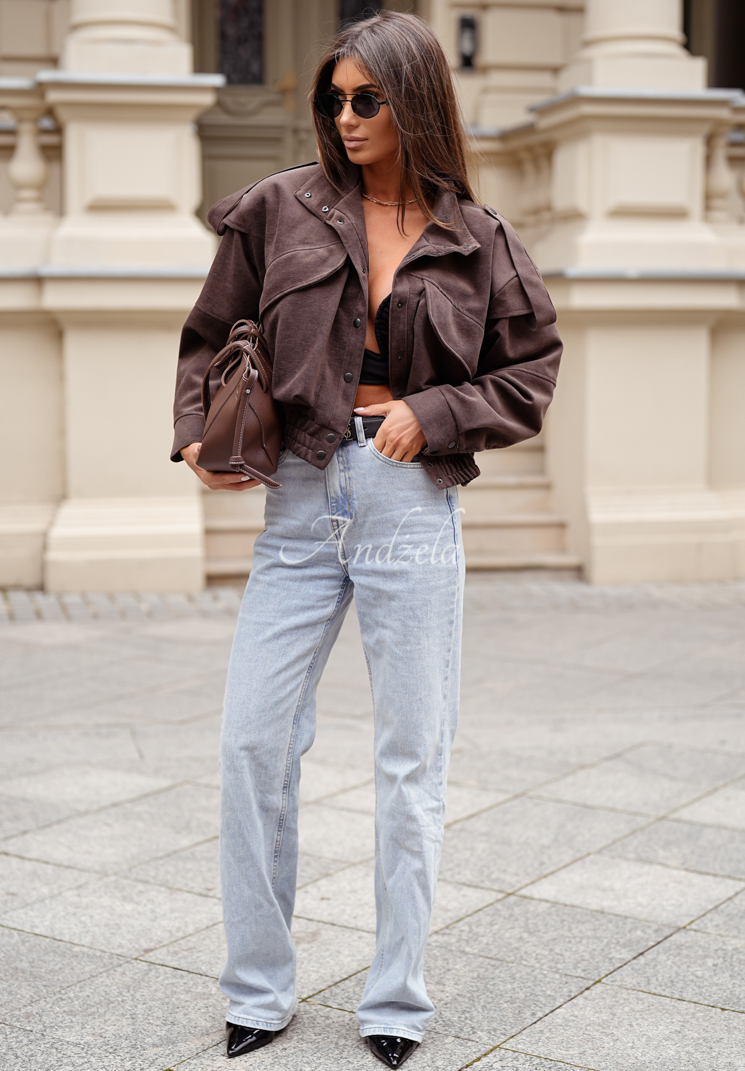 Krátká bomber bunda ideální pro přechodné období. Má kratší, oversized střih se stojáčkem. Bunda má polstrované ramenní vycpávky. Zapíná se na druky a má žebrovaný lem.