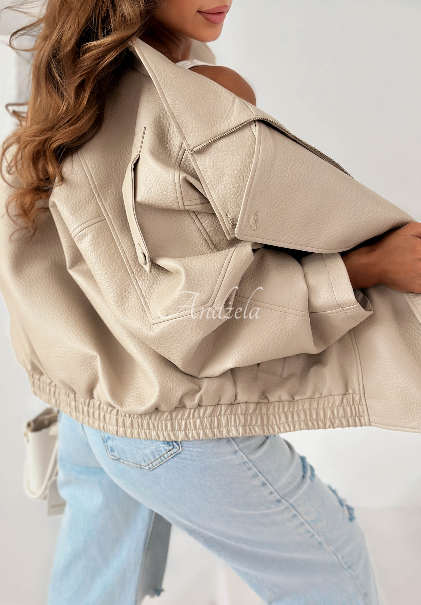 Kožená bunda s límcem v lehce oversize střihu. Jedná se o model s praktickými kapsami a elastickou gumou ve spodní části. Zapíná se na knoflíky a zip, uvnitř se nachází podšívka.