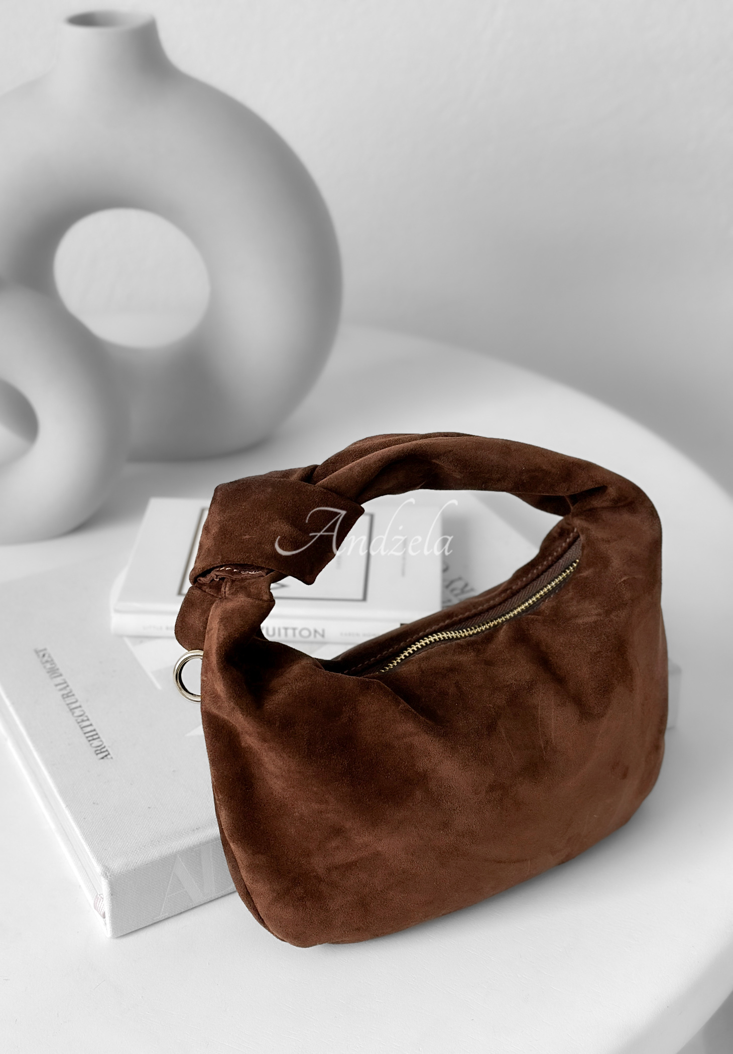 Semišová kabelka z vysoce kvalitní přírodní kůže. Jednokomorový model se zapínáním na zip. Má ucho, nastavitelný popruh a jednu vnitřní kapsu. Celek doplňují zlaté detaily.