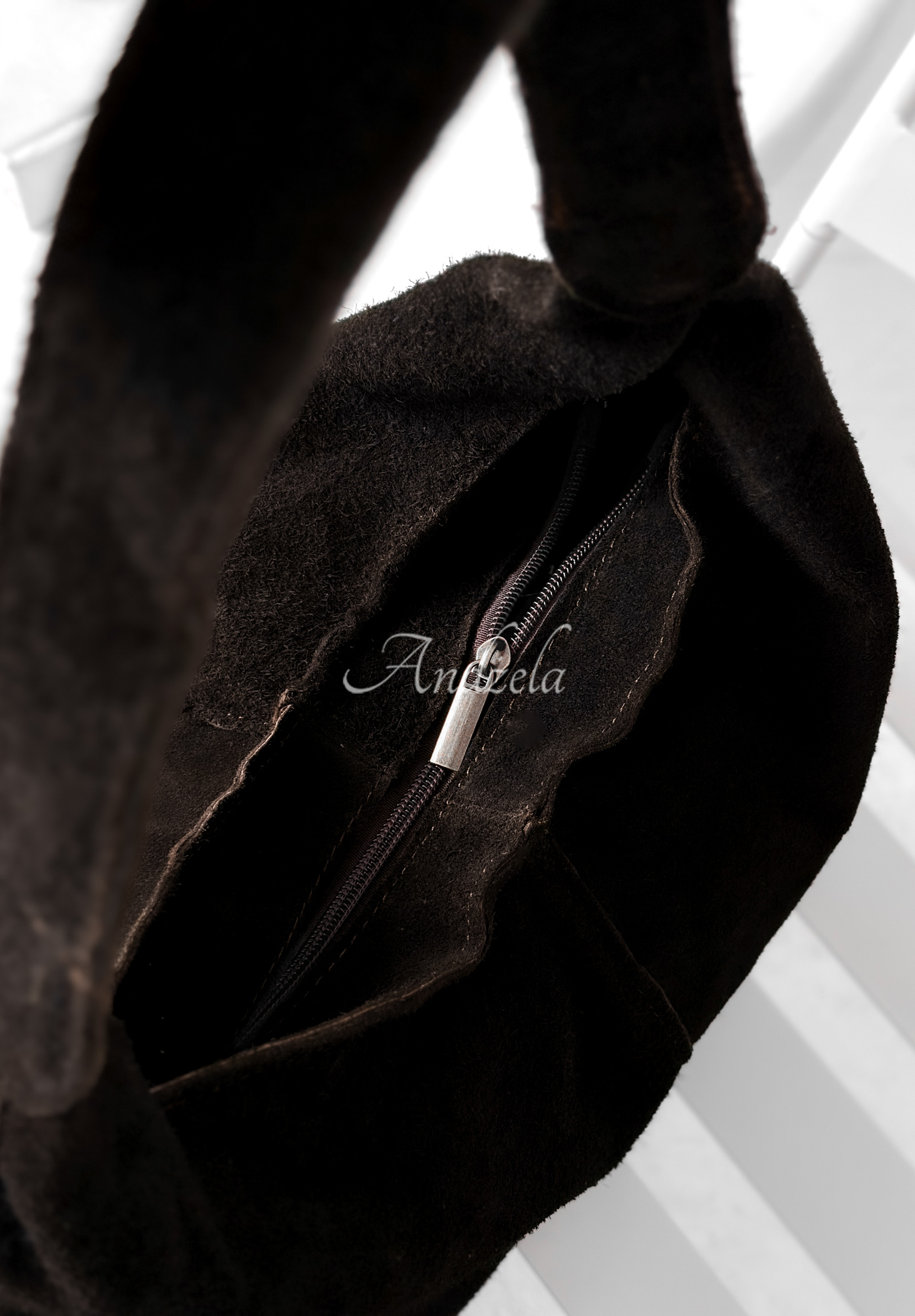 Semišová kabelka vyrobená z kvalitní přírodní kůže. Jde o jednokomorový model na zip se samostatnou neodnímatelnou vnitřní kapsičkou. Má neodnímatelné ucho a celek doplňují zlaté detaily.