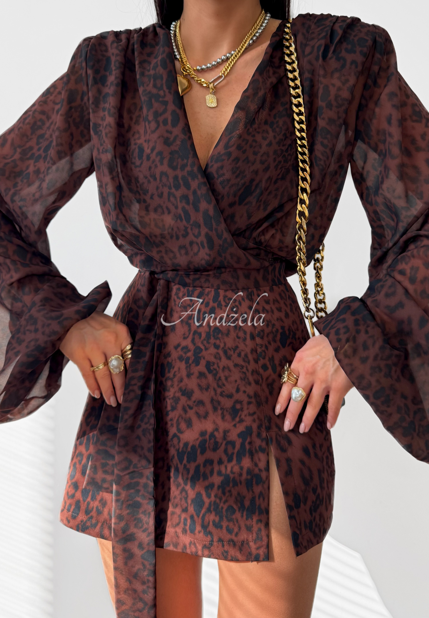 Viskózová halenka vynikající moderním leopardím vzorem. Vyrobená z lehké, transparentní tkaniny. Střih s efektním zavazováním ve spodní části a vycpávkami na ramenou, které dodávají tvar. Dlouhé rukávy jsou zakončené gumkou.