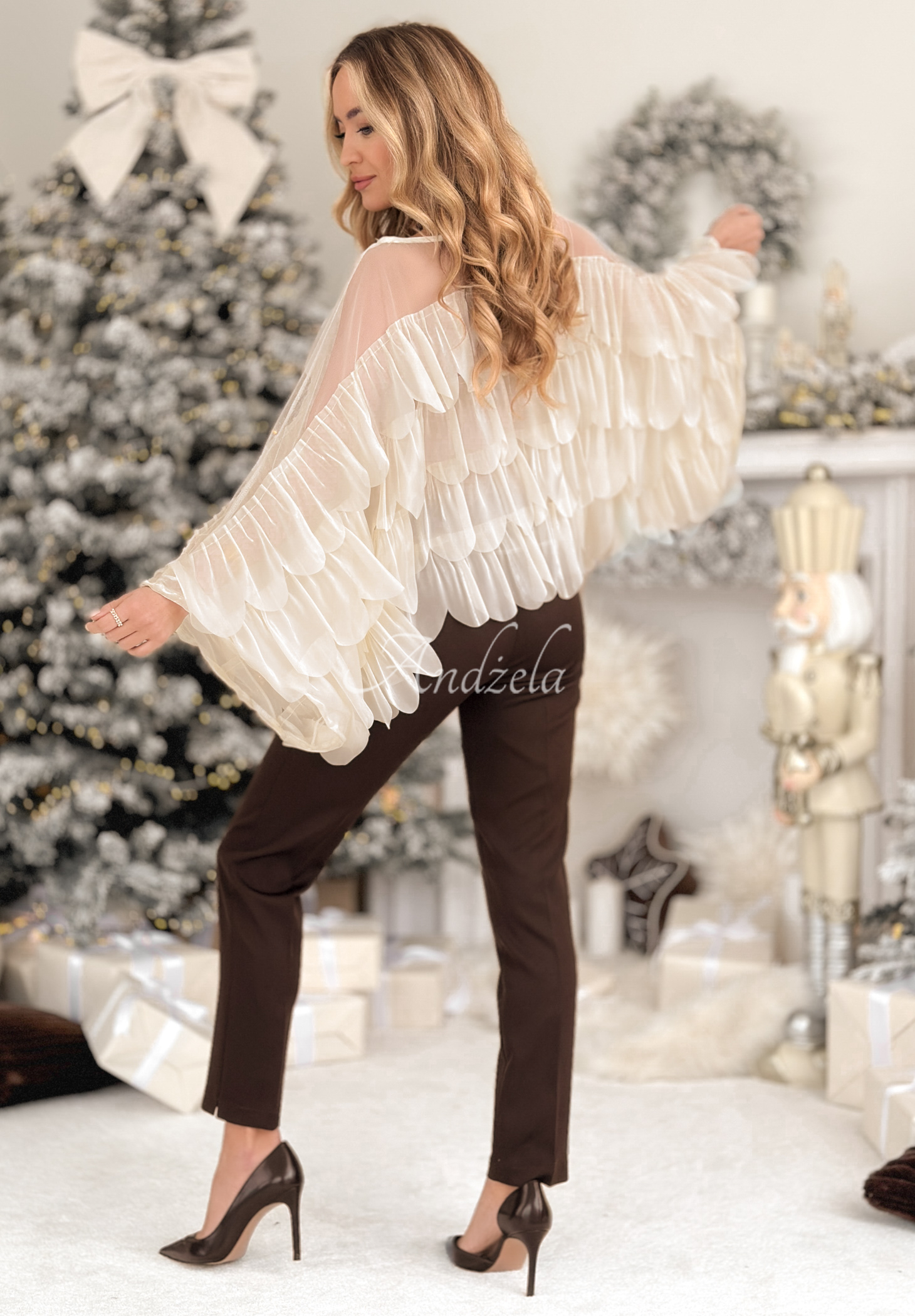 Viskózová halenka z tylového materiálu po celé ploše zdobená vzdušnými volánky. Model v kratším střihu se zaobleným výstřihem a širokými rukávy.
