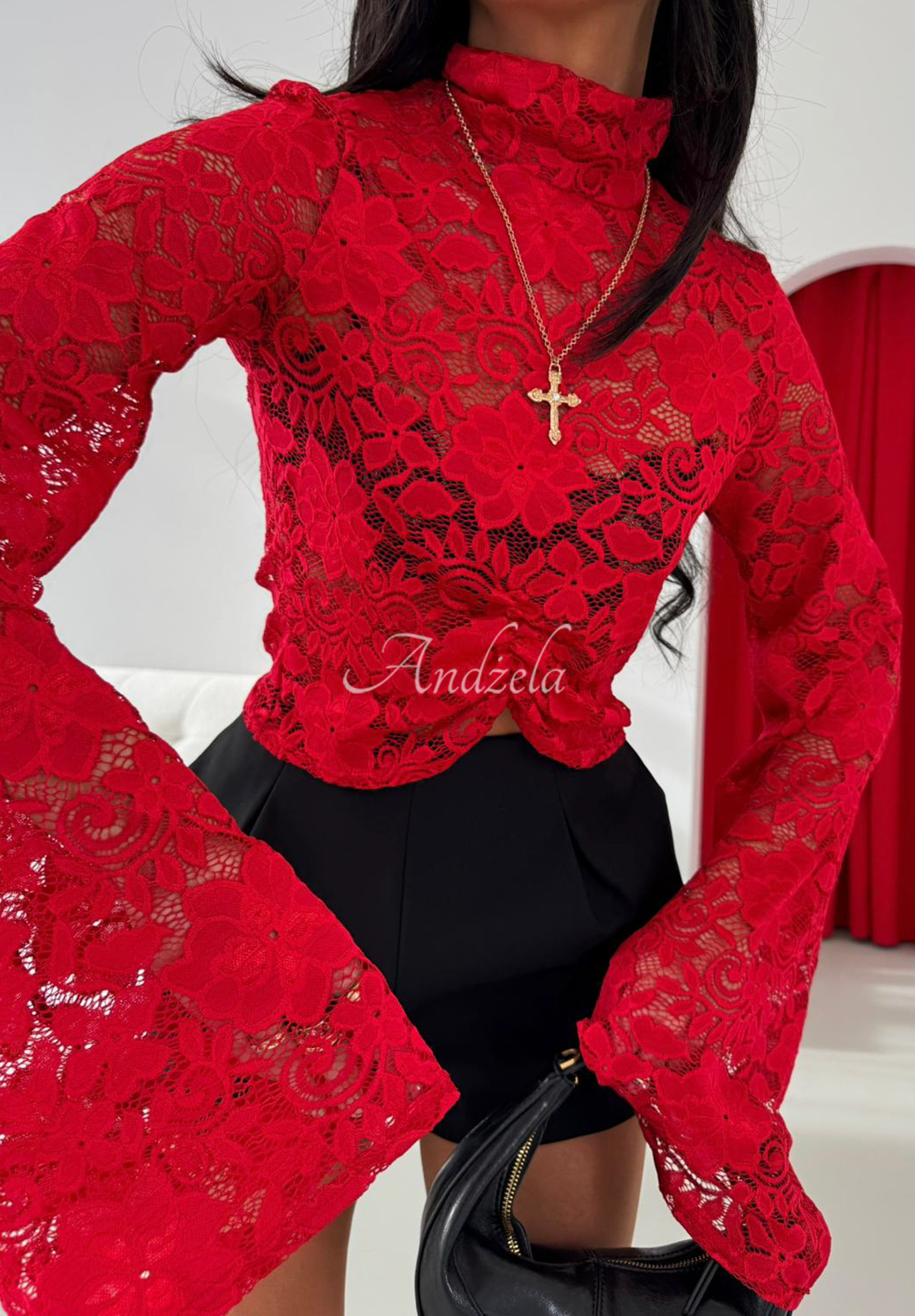 Krajková halenka vyrobená z transparentního viskózového materiálu. Jde o střih se stojáčkem a efektním řasením, s dlouhými rukávy rozšiřujícími se na konci.