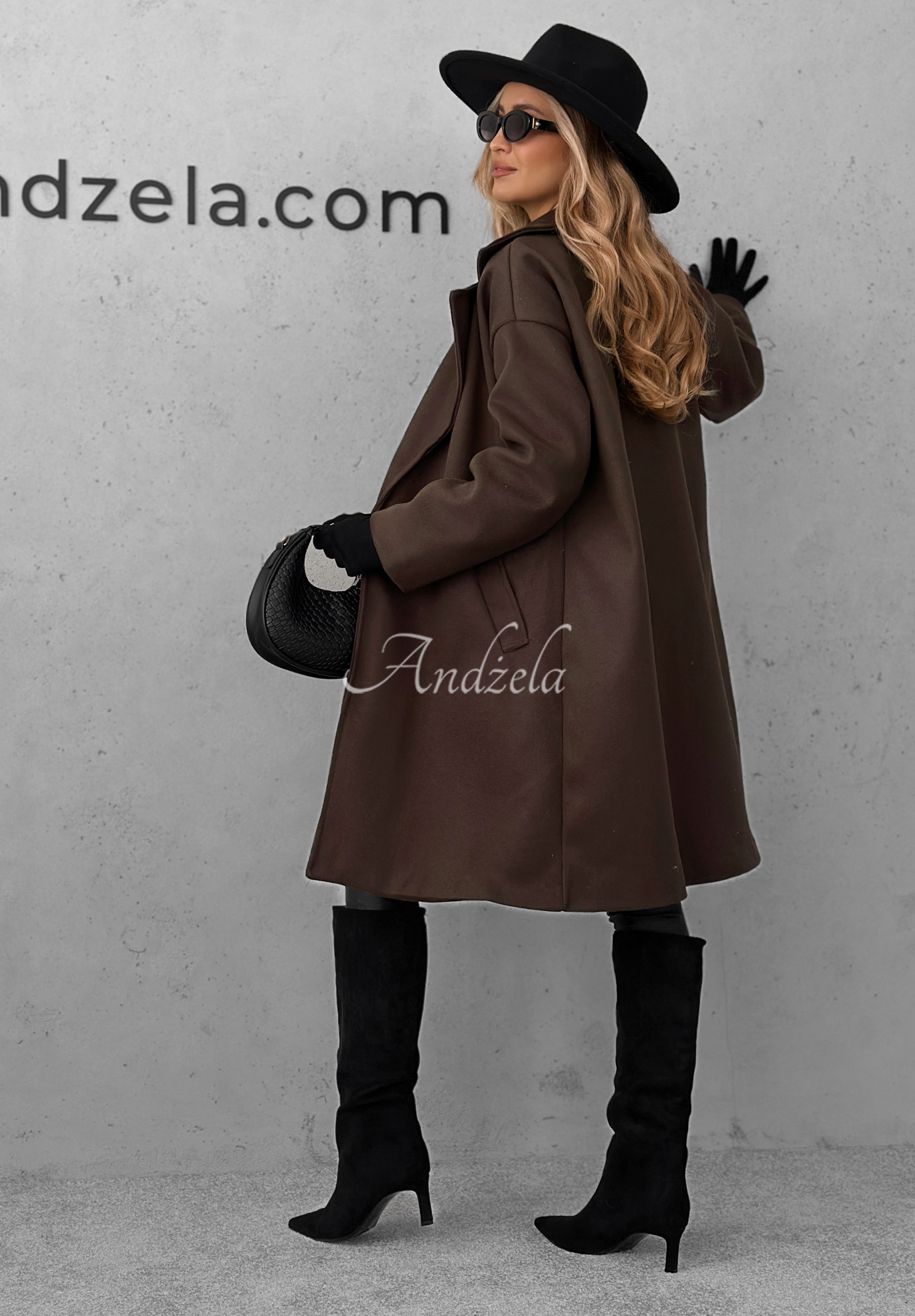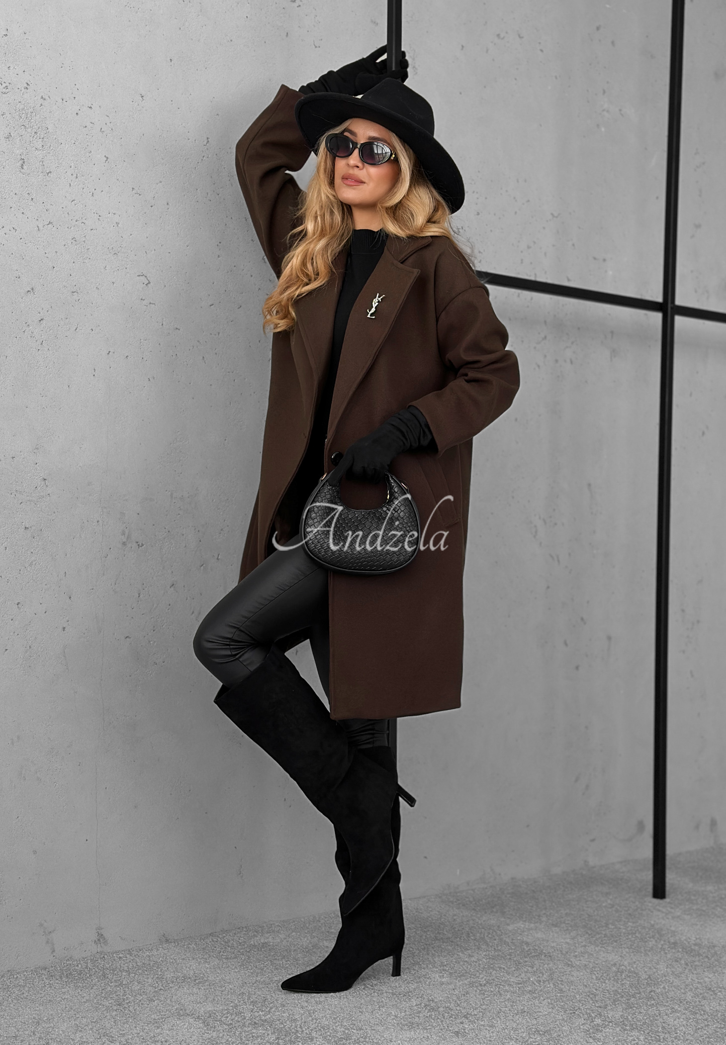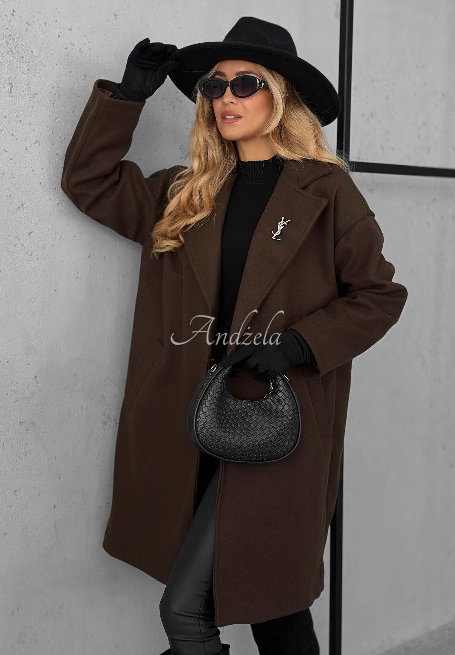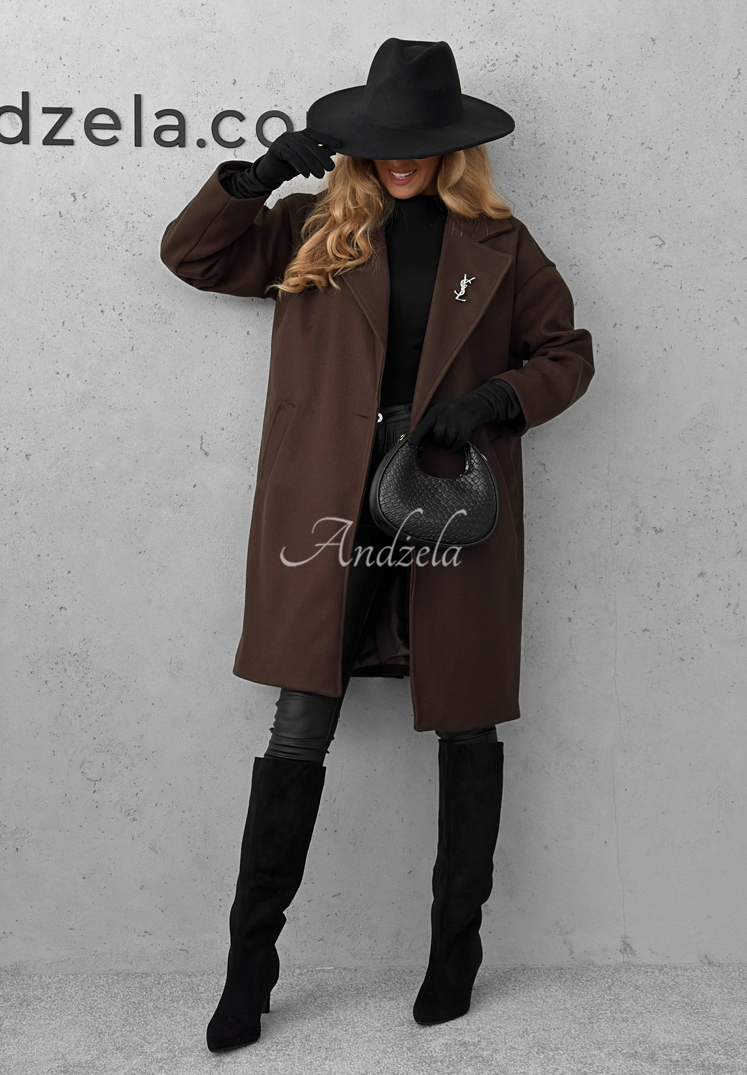 Klasický kabát s dlouhým střihem a límcem. Model se zapínáním na jeden knoflík, s podšívkou a dlouhými rukávy. Vpředu se nacházejí funkční kapsy, k soupravě je přiložena ozdobná brož.