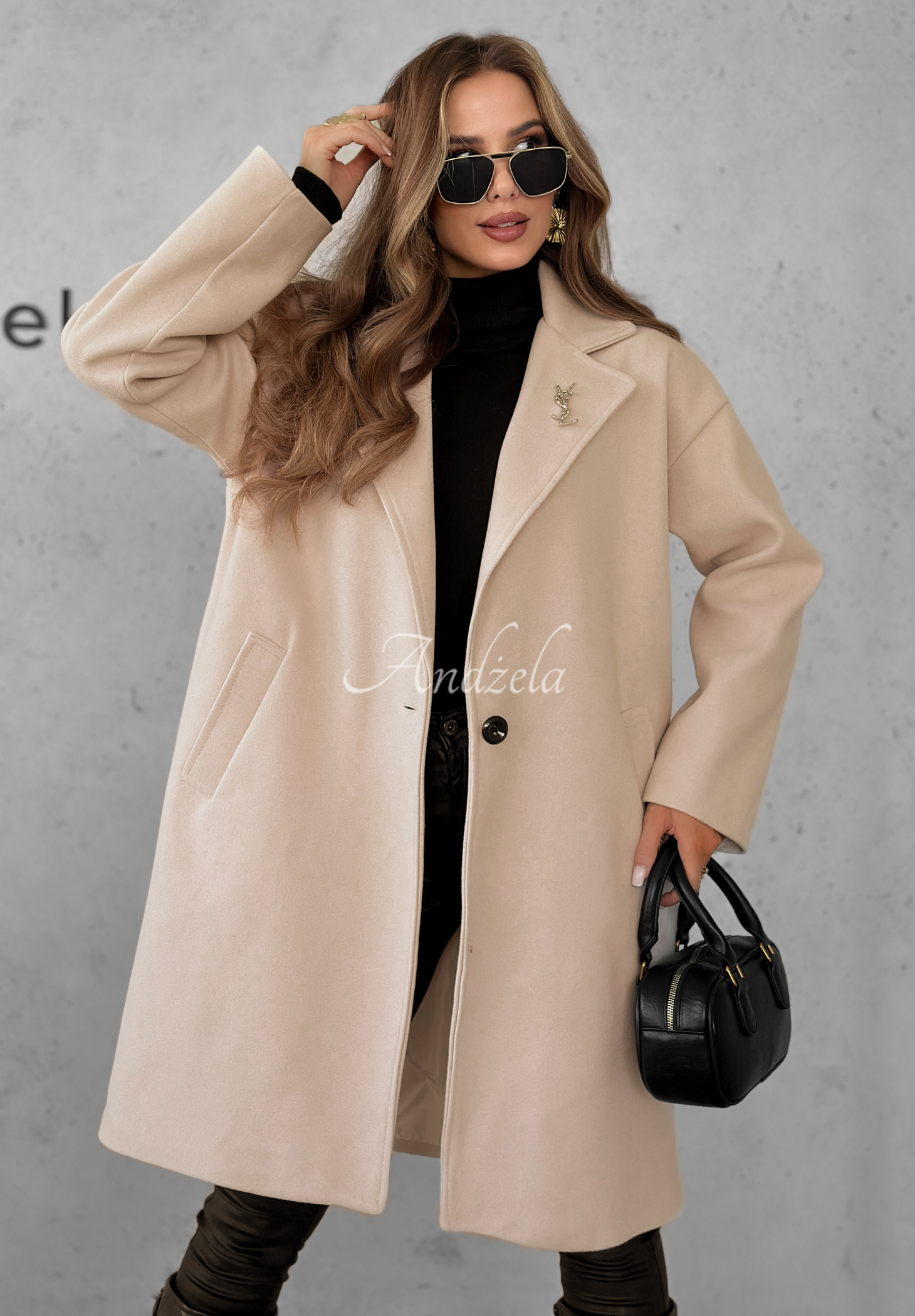 Klasický kabát s dlouhým střihem a límcem. Model se zapínáním na jeden knoflík, s podšívkou a dlouhými rukávy. Vpředu se nacházejí funkční kapsy, k soupravě je přiložena ozdobná brož.