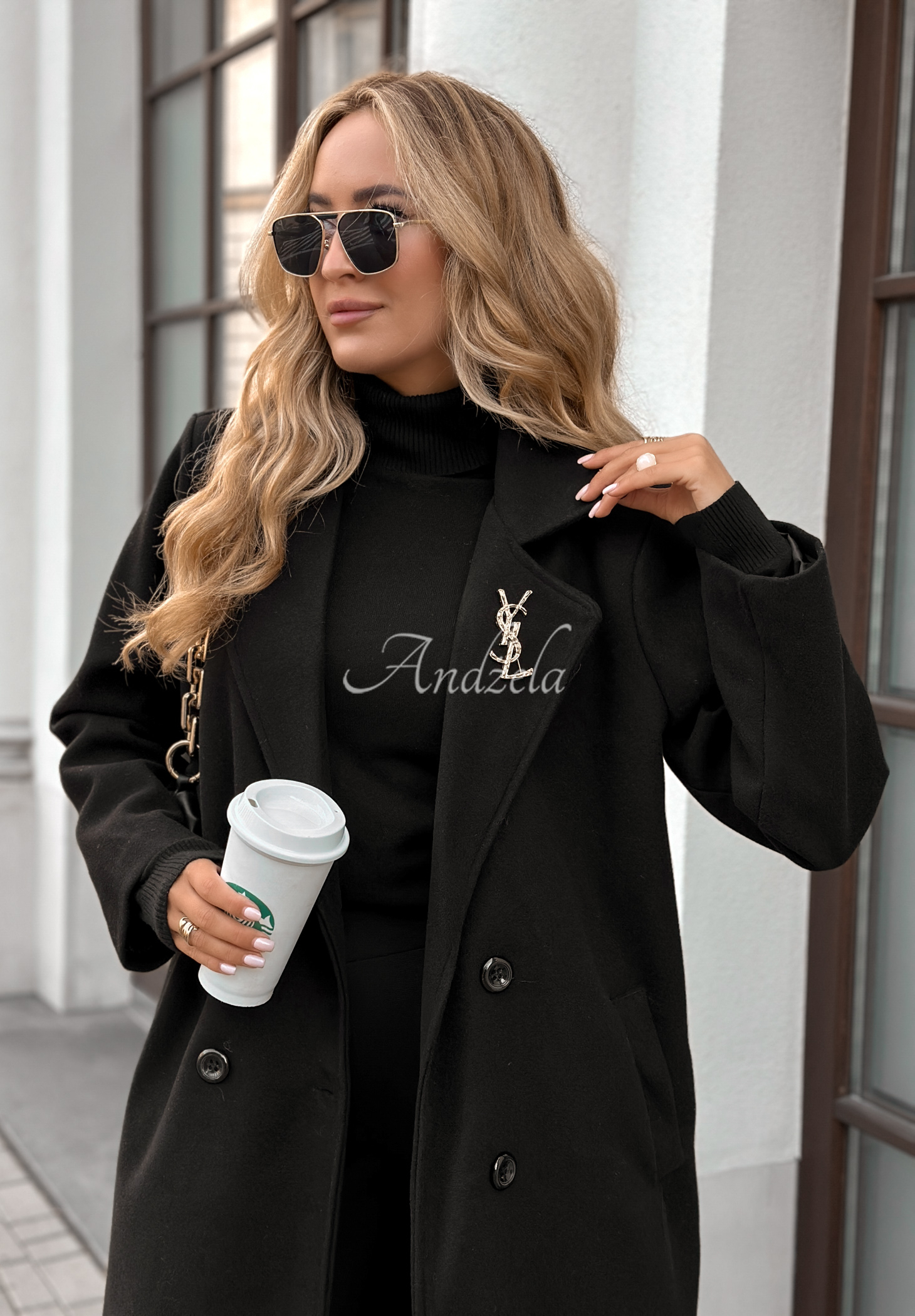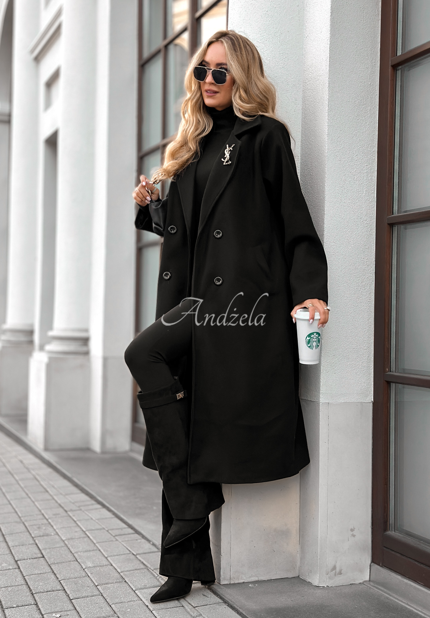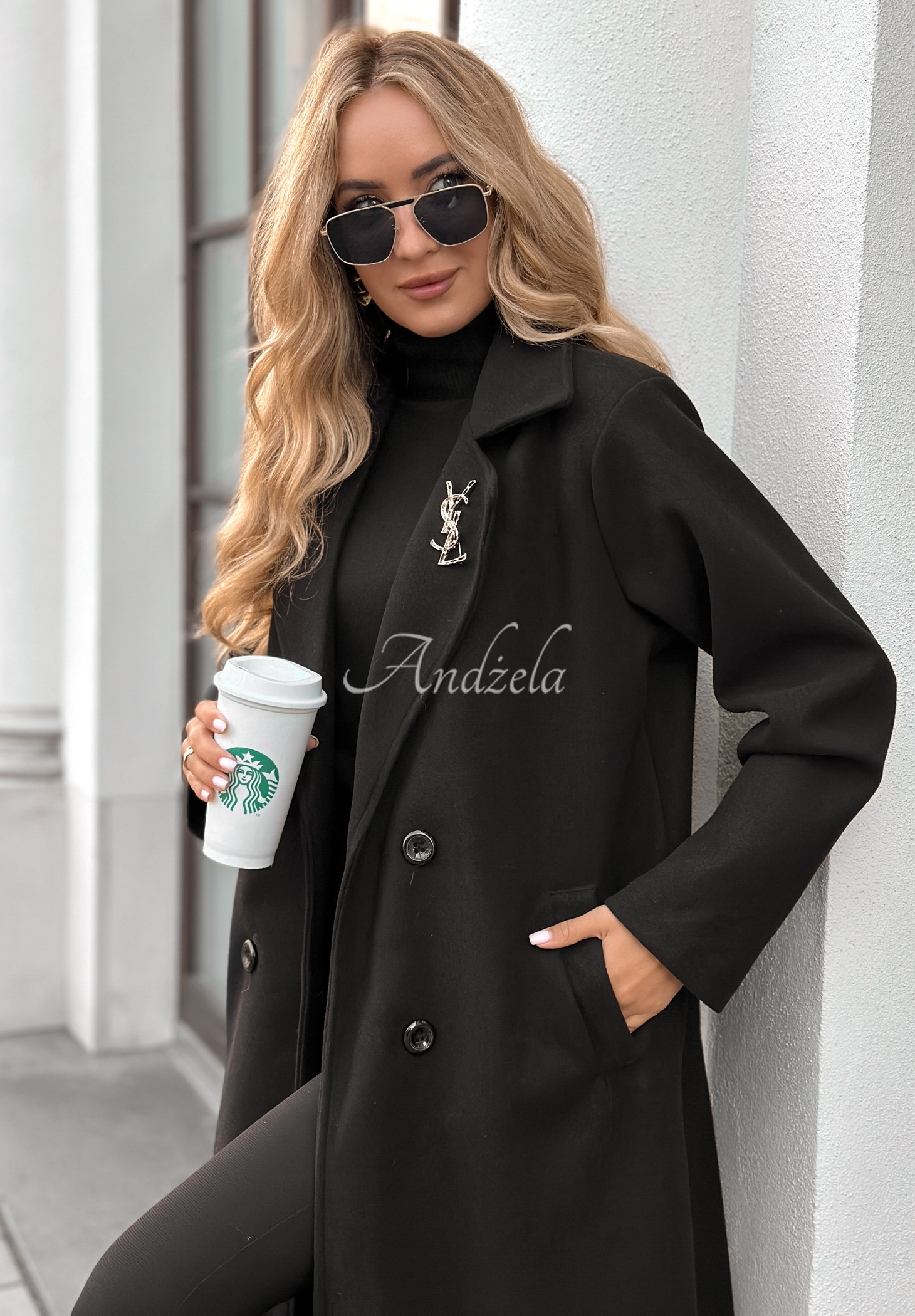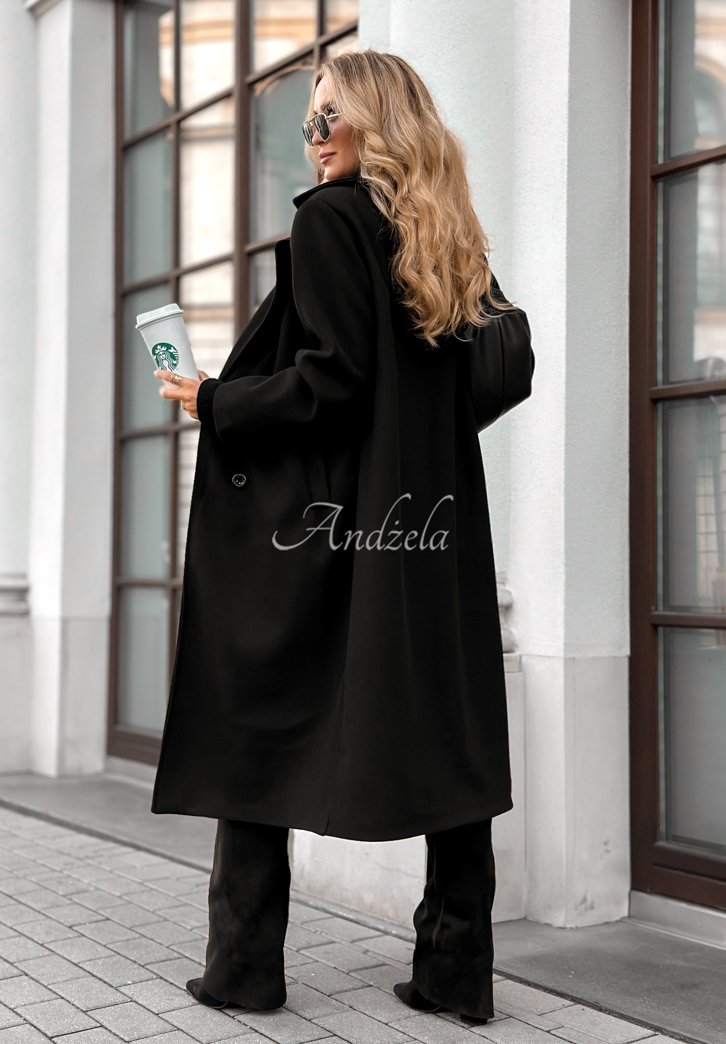 Dvouřadý kabát v oversize střihu, zapínaný na knoflíky. Model má límeček a kapsy v úrovni pasu.