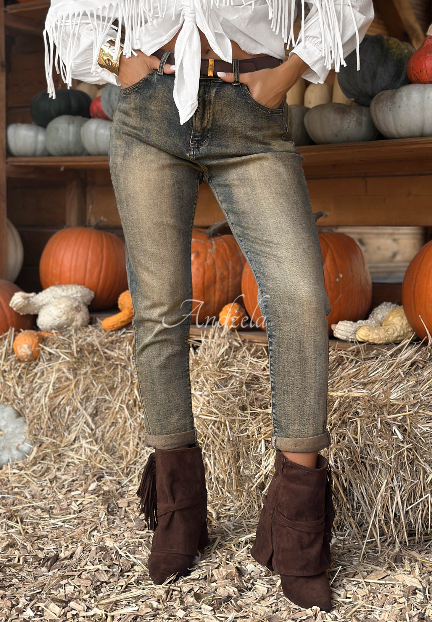 Modelka má výšku 165 cm, prezentuje velikost 38/M.