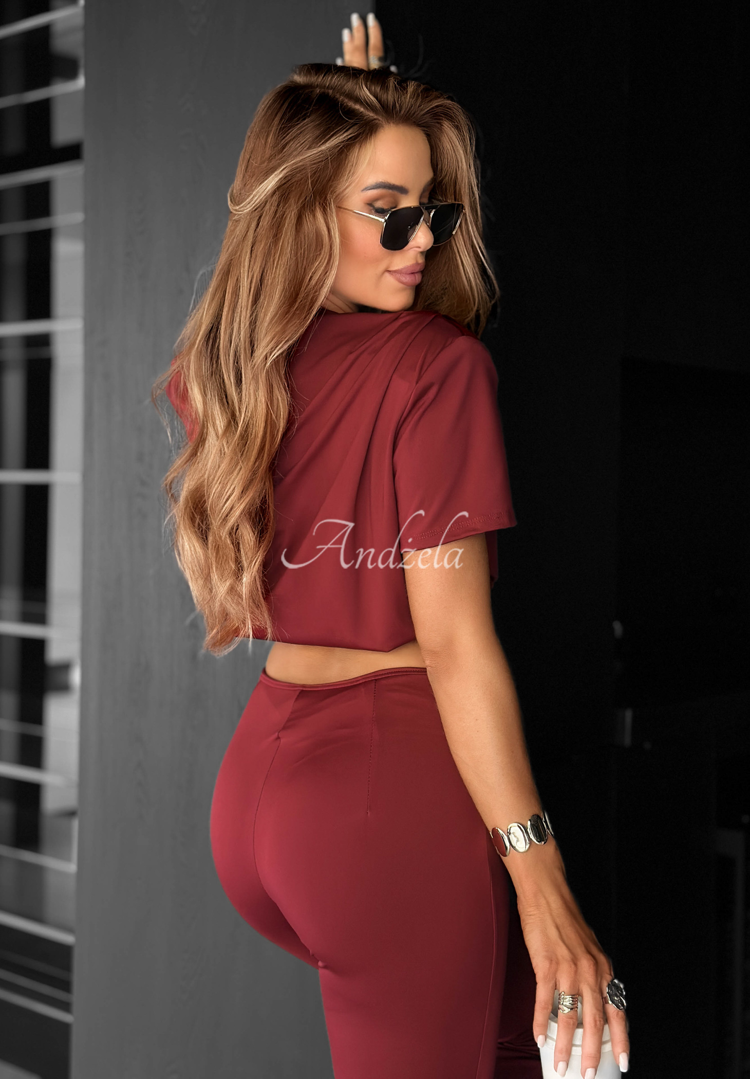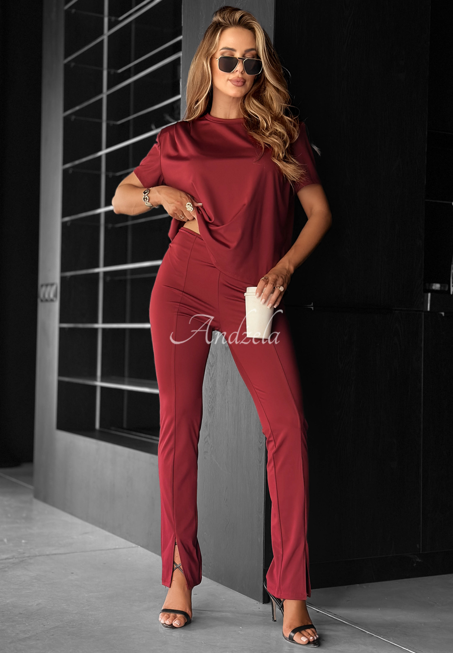 Kalhoty s vyšším pasem vyrobené z elastického materiálu. Přiléhavý model, který se vyznačuje prošíváním podél nohavic a jemnými rozparky na jejich zakončení.
