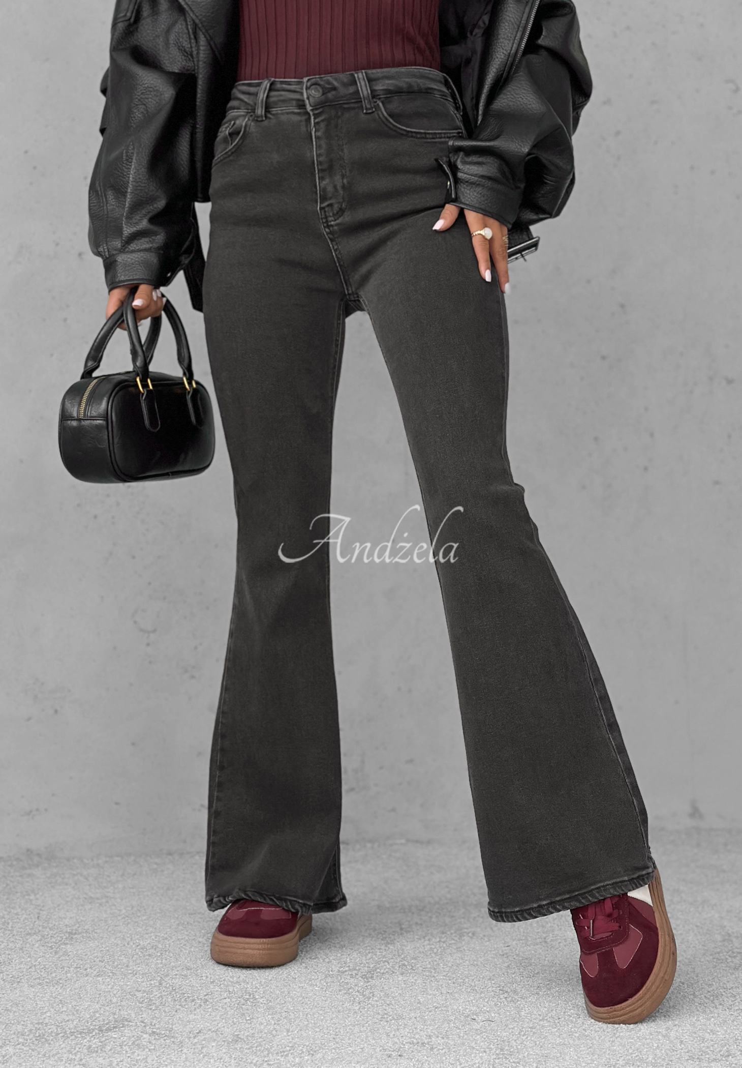 Zvonové džíny z elastického materiálu. Model se středním pasem, zapínání na zip a knoflík. Kapsy se nacházejí vpředu i vzadu.* elastický materiál* střih do zvonu* střední pas* poutka* zapínání na zip a knoflík* kapsy vpředu i vzadu