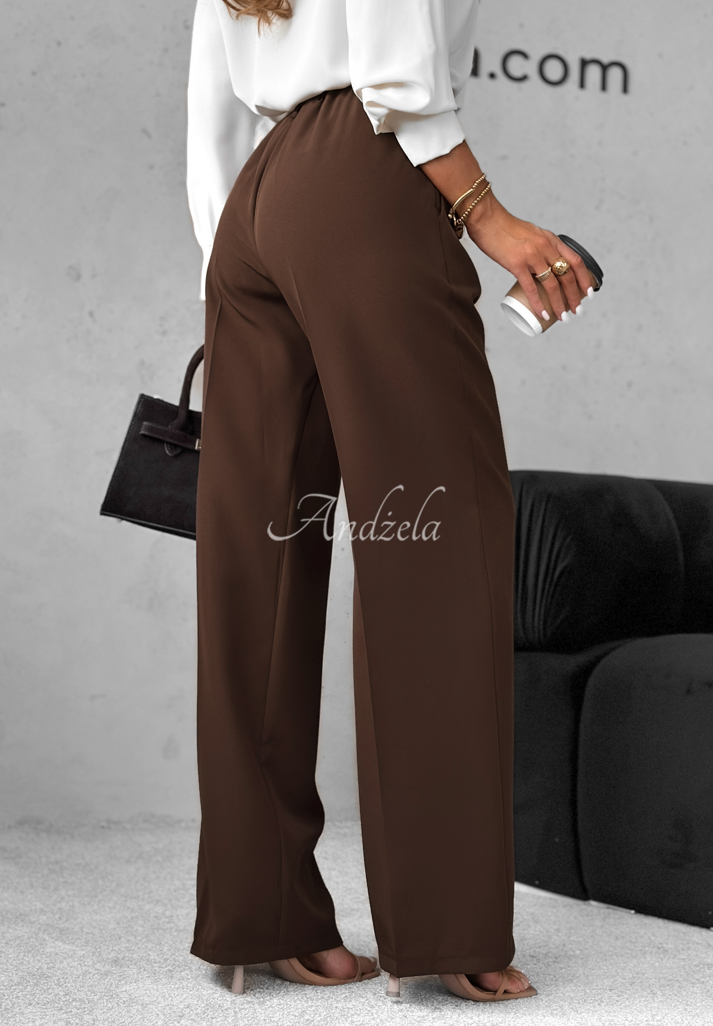 Látkové kalhoty střihu wide leg, vyrobené z lehké tkaniny. Model s širokými pukovými nohavicemi a vysokým pasem. Zapíná se na zip a knoflík, v pase má elastickou gumu. Vpředu se nacházejí funkční kapsy.