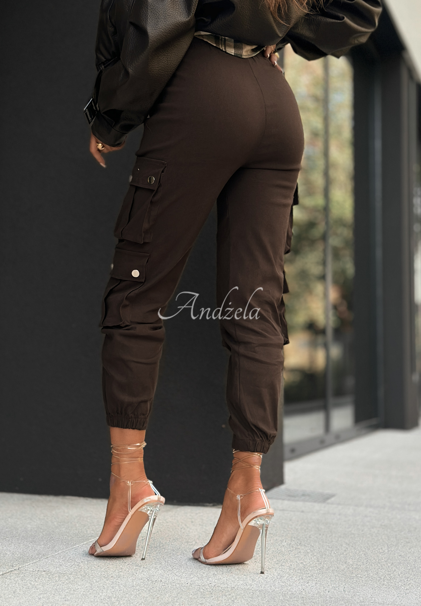 Kalhoty vyrobené z elastického viskózového materiálu. Model se zvýšeným pasem, v pase má elastickou gumu se šňůrkou. Praktické kapsy se nacházejí vpředu i vzadu, stejně tak i na nohavicích. Nohavice jsou zakončené manžetou.