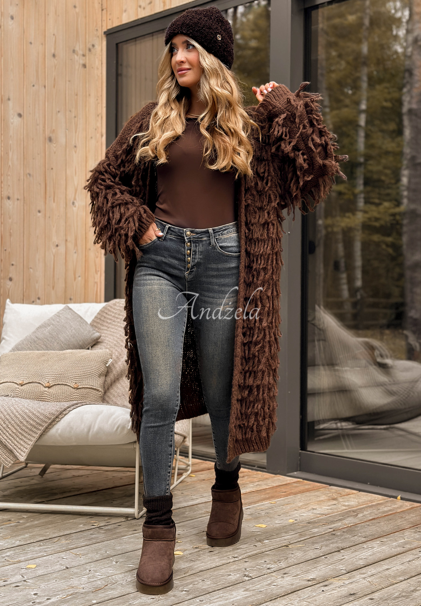 Modelka má výšku 170 cm, prezentuje velikost 36/S.