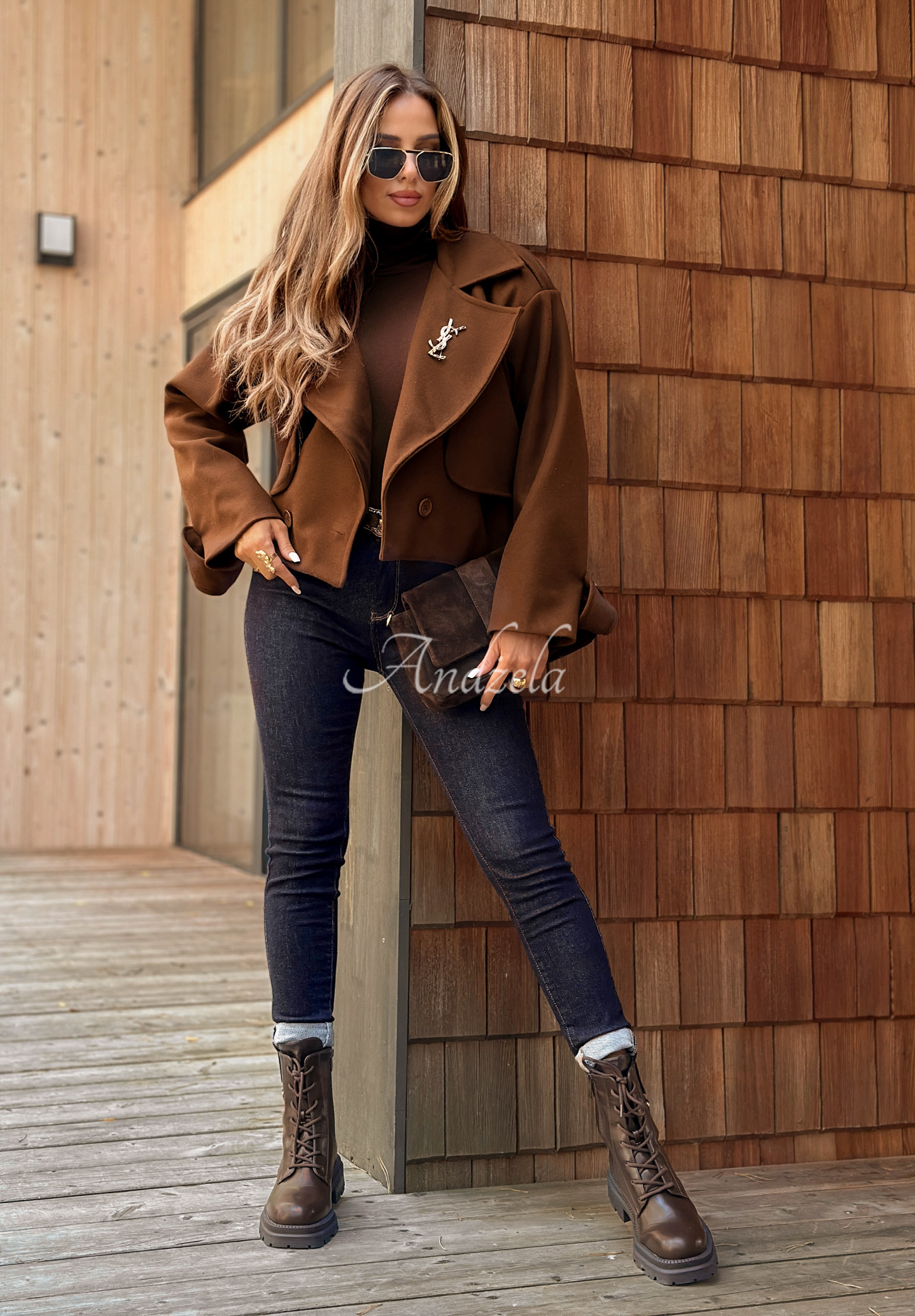 Modelka má výšku 165 cm, prezentuje velikost 38/M.