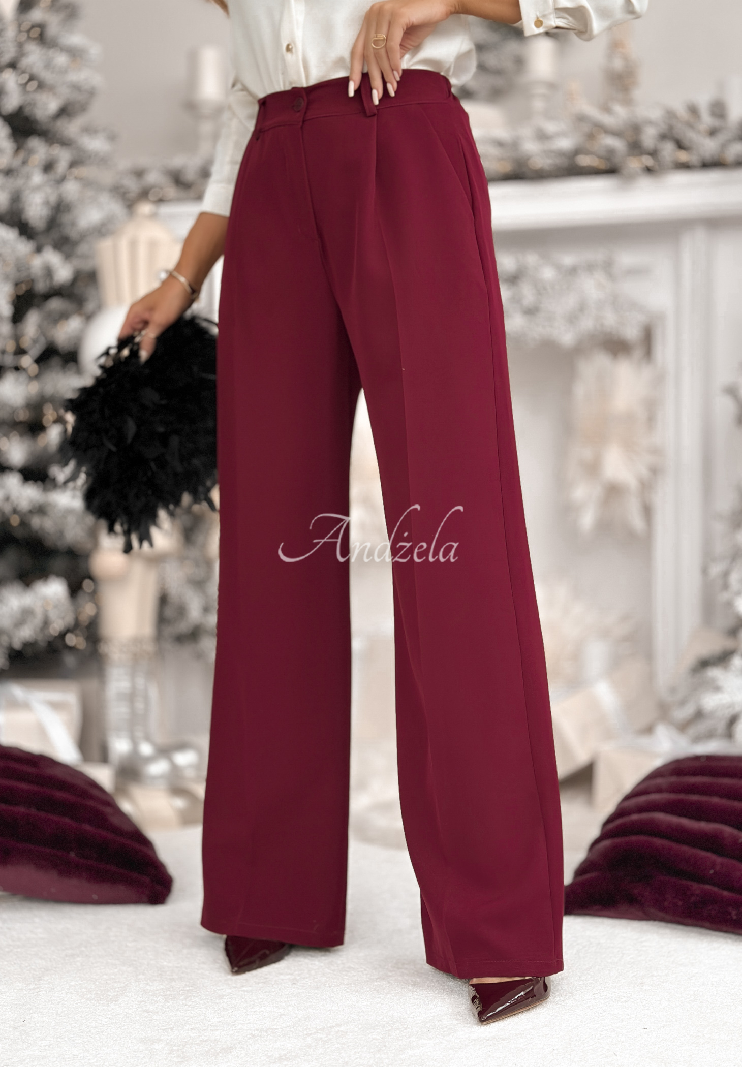 Látkové kalhoty střihu wide leg, vyrobené z lehké tkaniny. Model s širokými pukovými nohavicemi a vysokým pasem. Zapíná se na zip a knoflík, v pase má elastickou gumu. Vpředu se nacházejí funkční kapsy.