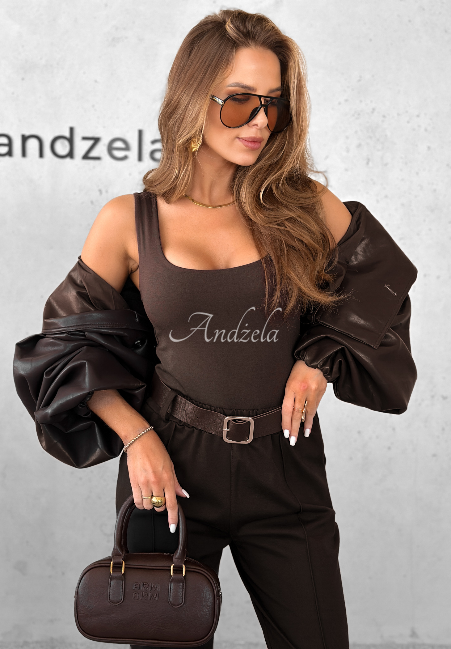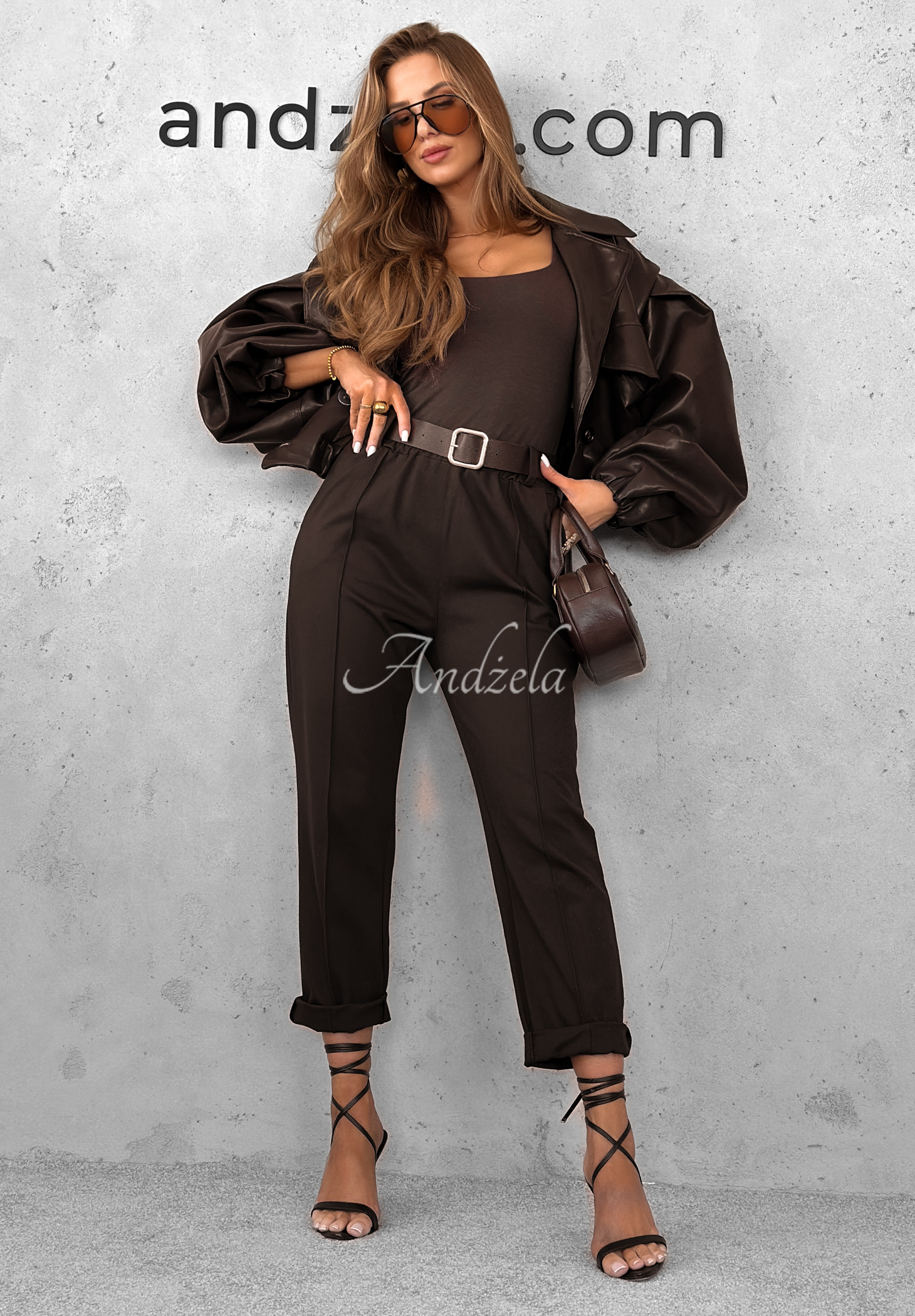Látkové kalhoty z měkké viskózové tkaniny. Model má nohavice zužující se ke spodní části a poutka. Vpředu se nacházejí funkční kapsy a v pase elastická guma. Součástí soupravy je pásek.