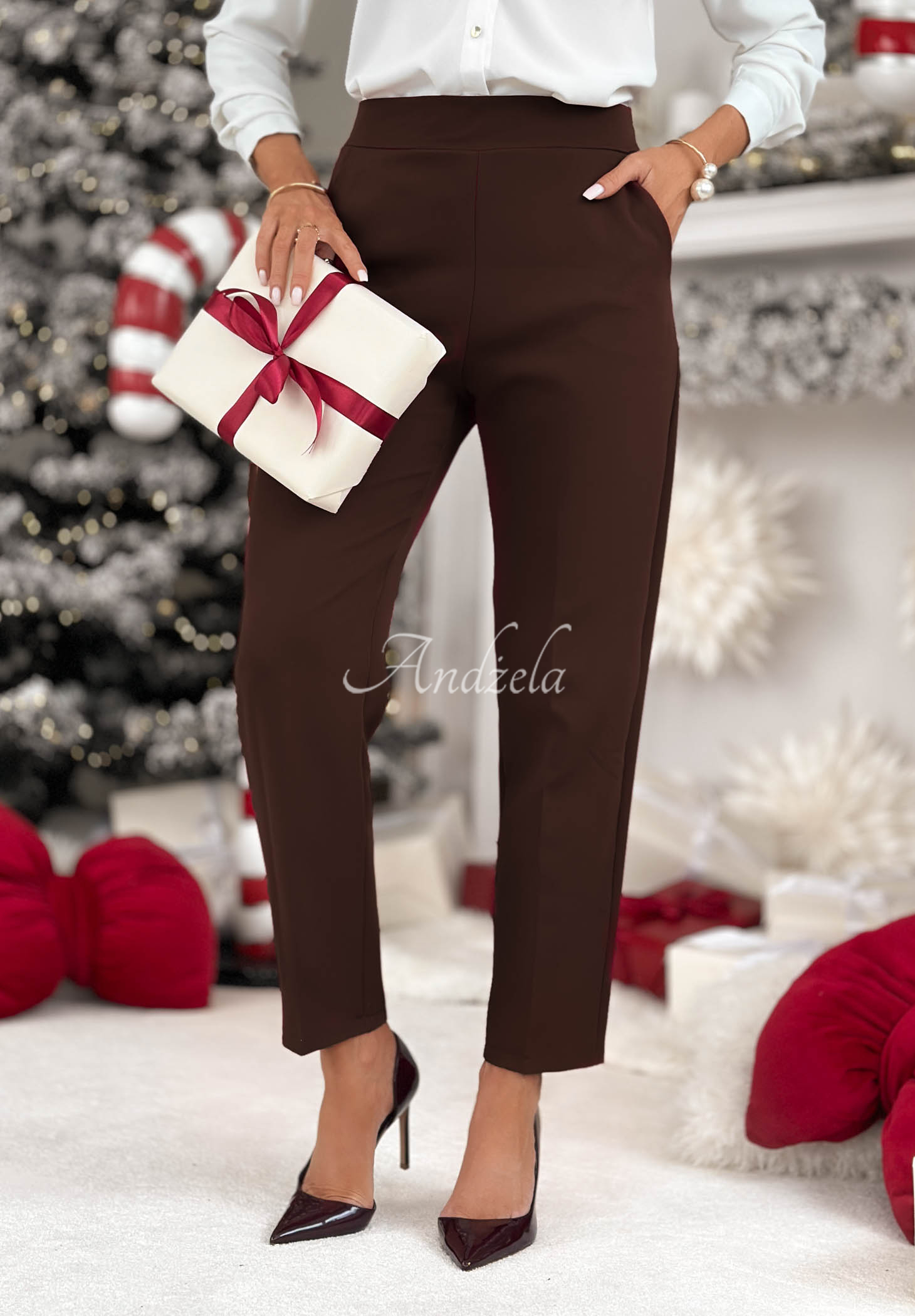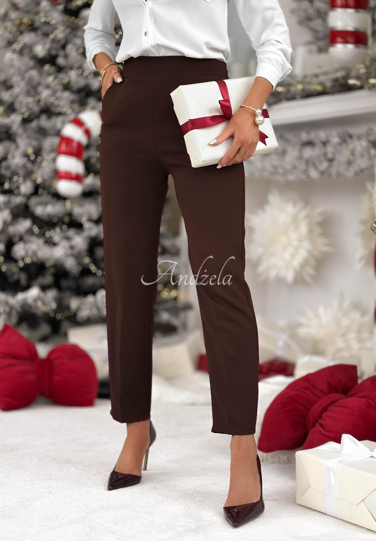 Elegantní kalhoty cigaretového střihu jsou modelem s vysokým pasem a zúženými nohavicemi s puky. V zadní části pasu se nachází elastická guma a vpředu funkční kapsy.