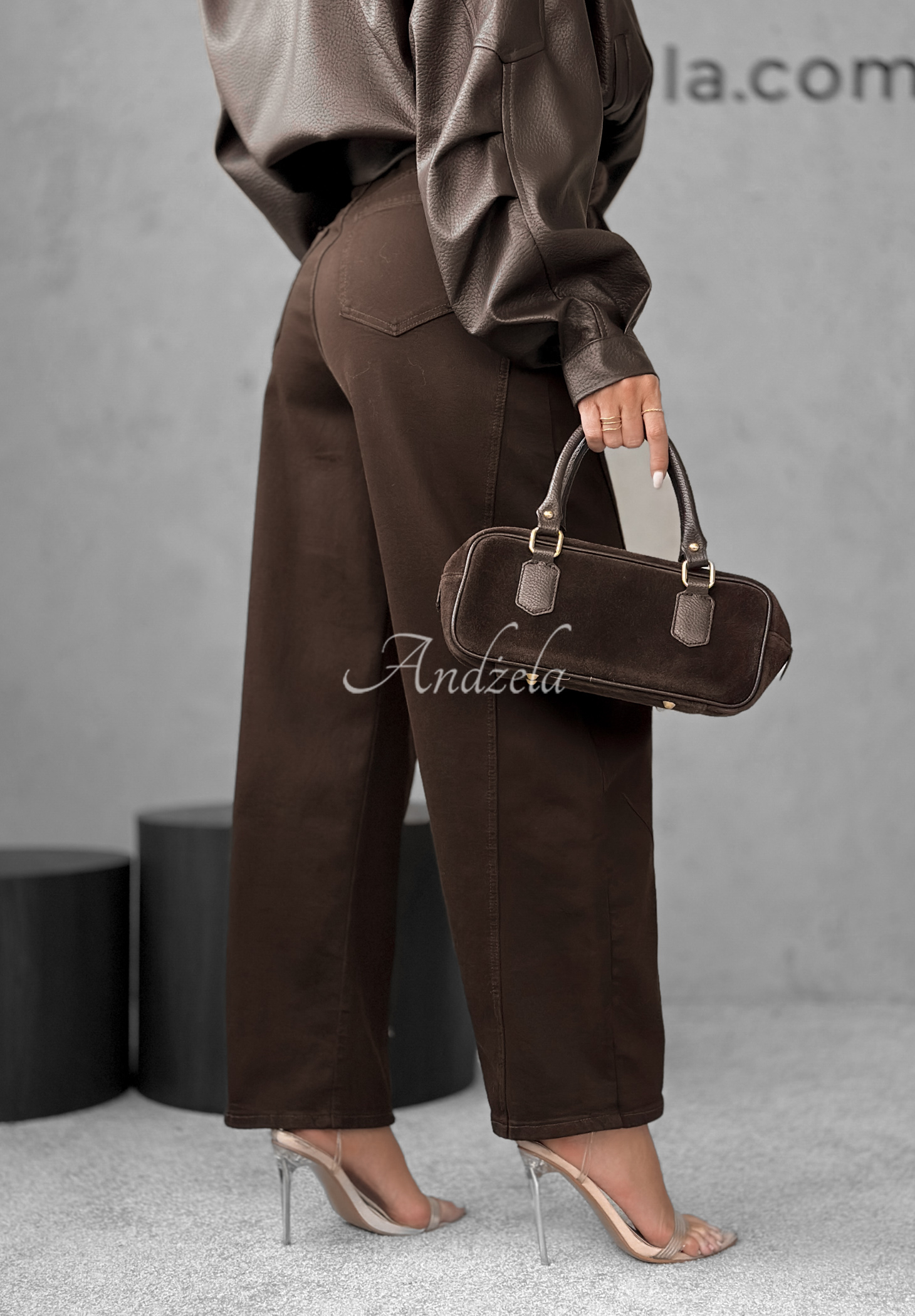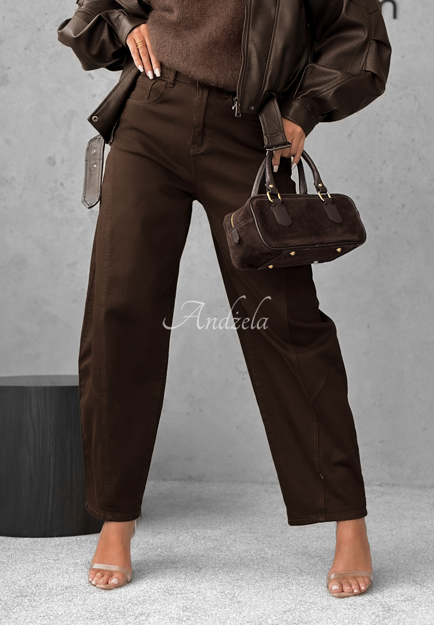 Džíny z elastické bavlněné tkaniny. Jde o model střihu balloon s vysokým pasem a širokými nohavicemi zužujícími se směrem dolů. Zepředu i zezadu se nacházejí funkční kapsy. Zapínají se na zip a knoflík.
