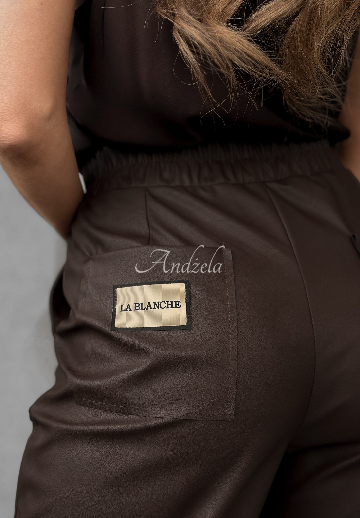 Kalhoty z voskovaného materiálu. Model s elastickou gumou v pase, se zadními kapsami a nohavicemi zužujícími se směrem dolů.* elastický materiál* elastická guma v pase* zadní kapsy* voskovaná úprava* nohavice zužující se směrem dolů