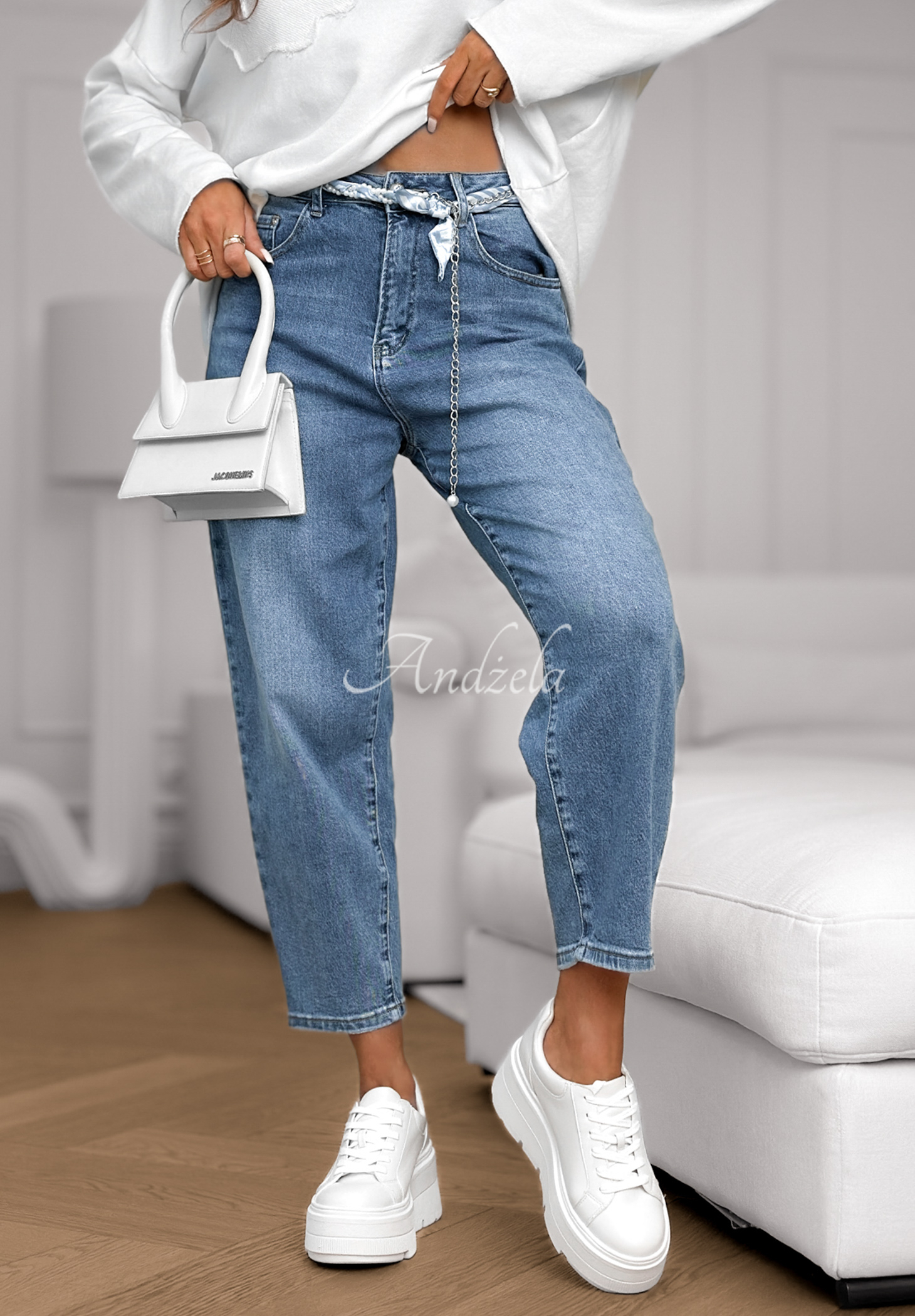 Džíny vyrobené z elastické tkaniny. Jde o model střihu balloon s vysokým pasem, který má praktické kapsy vpředu i vzadu. Zapíná se na zip a knoflík. Součástí je látkový pásek s ozdobnými detaily.