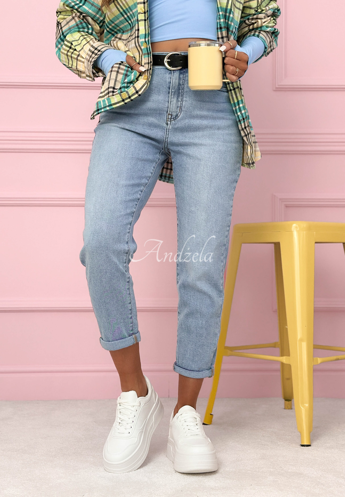 Džíny ve střihu mom fit, vyrobené z elastického materiálu. Jedná se o model se zvýšeným pasem, zapínaný na zip a knoflík. Vpředu i vzadu se nacházejí funkční kapsy. Součástí balení je pásek s přívěskem.