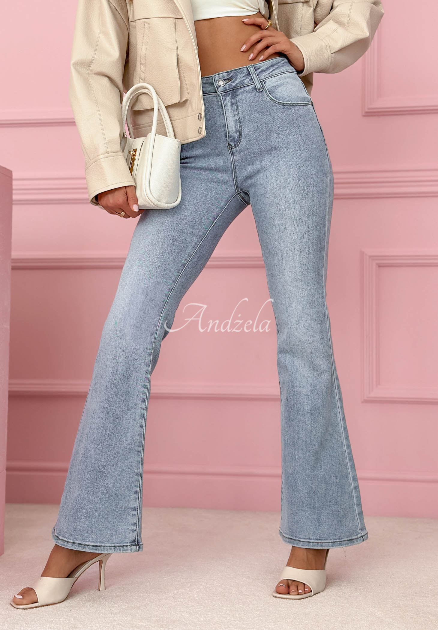 Zvonové džíny vyrobené z elastického materiálu. Jedná se o model se středním pasem, zapínaný na zip a knoflík. Vpředu i vzadu se nacházejí funkční kapsy.