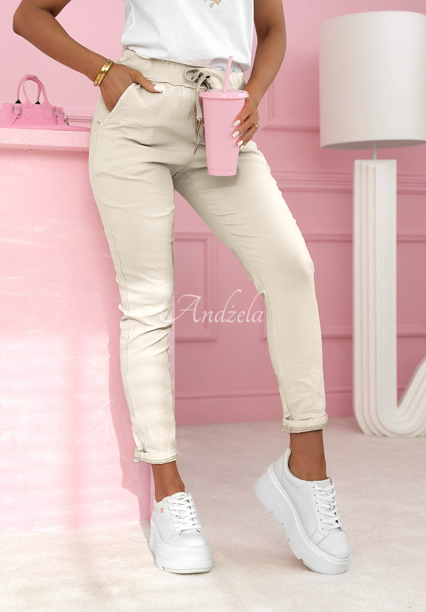 Kalhoty s efektem zmačkání, vyrobené z elastické viskózové tkaniny. Jde o model s vysokým pasem. Mají v pase gumu se stahovací šňůrkou a také praktické kapsy vpředu.
