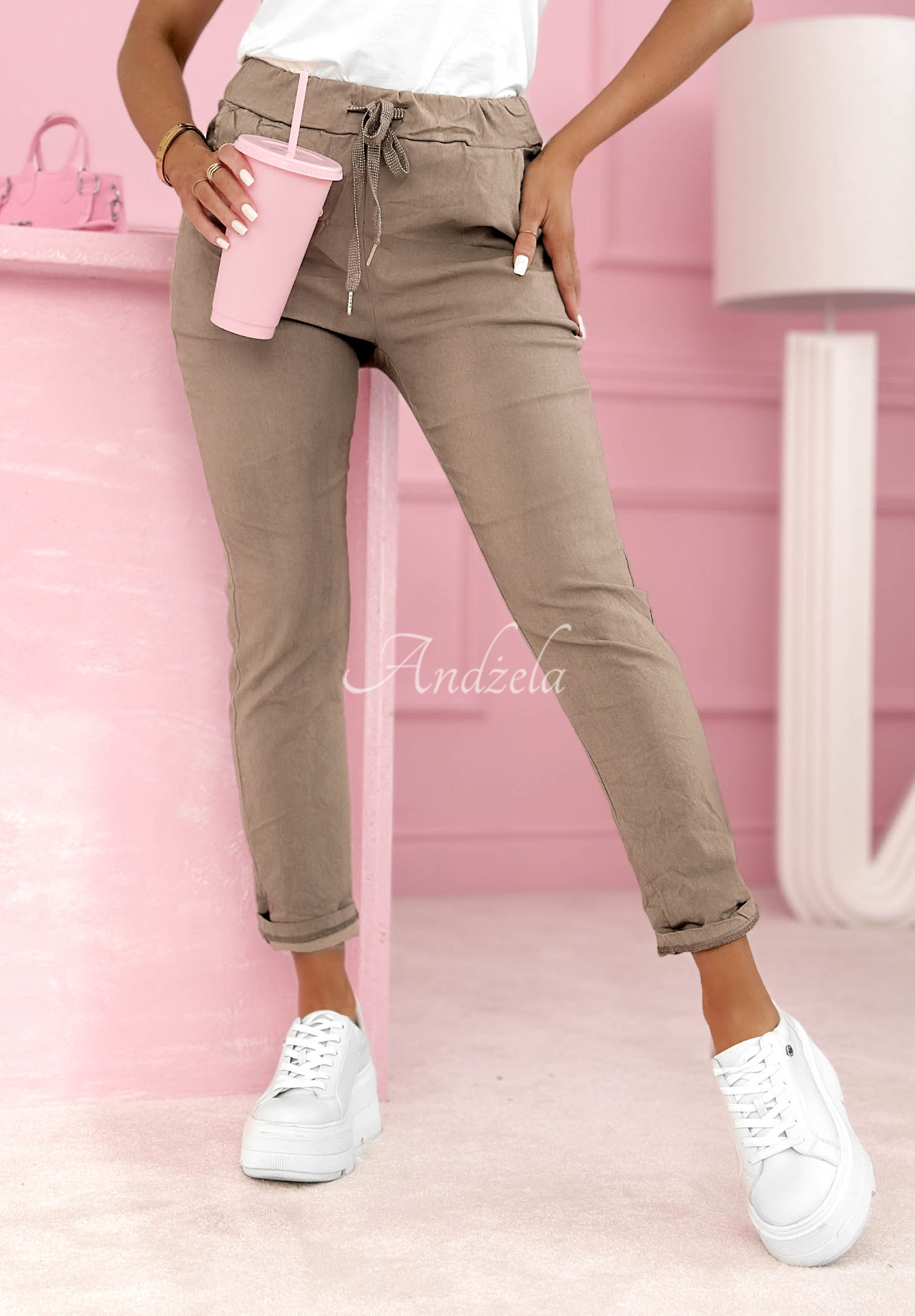 Kalhoty s efektem zmačkání, vyrobené z elastické viskózové tkaniny. Jde o model s vysokým pasem. Mají v pase gumu se stahovací šňůrkou a také praktické kapsy vpředu.