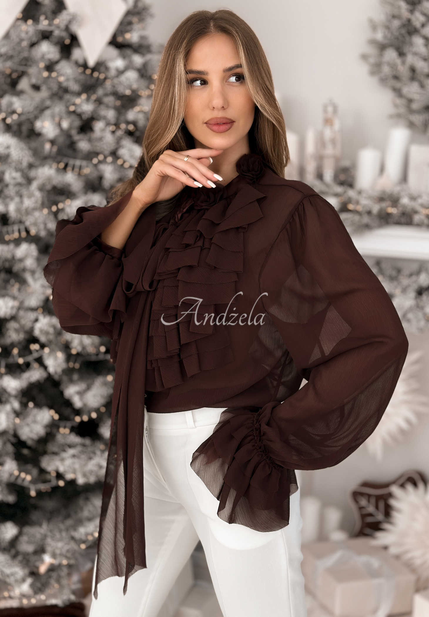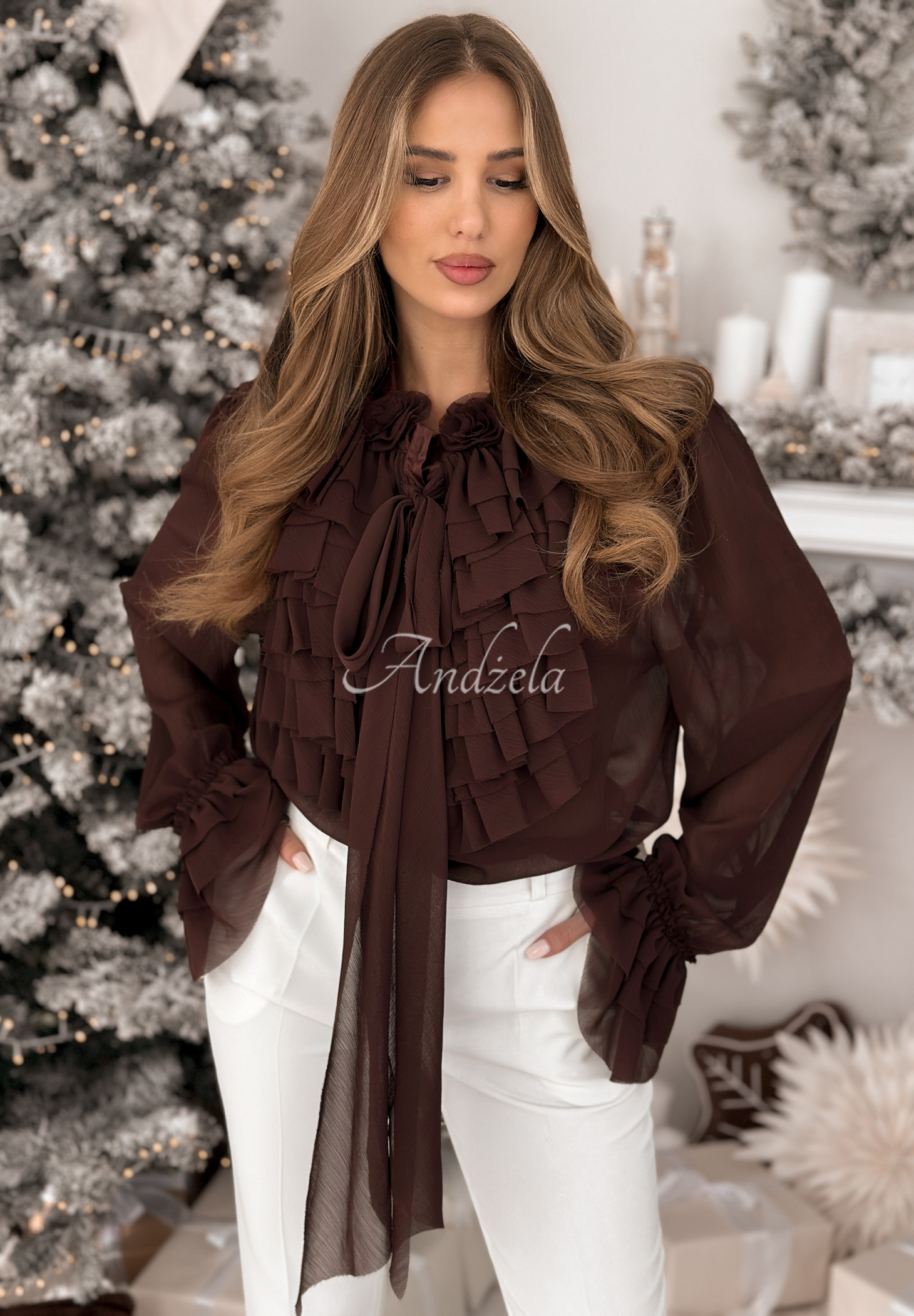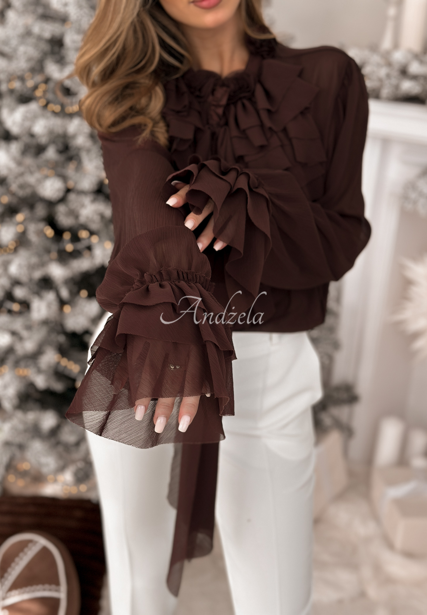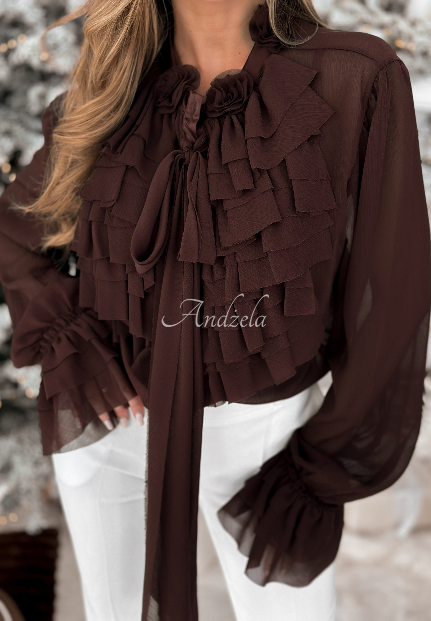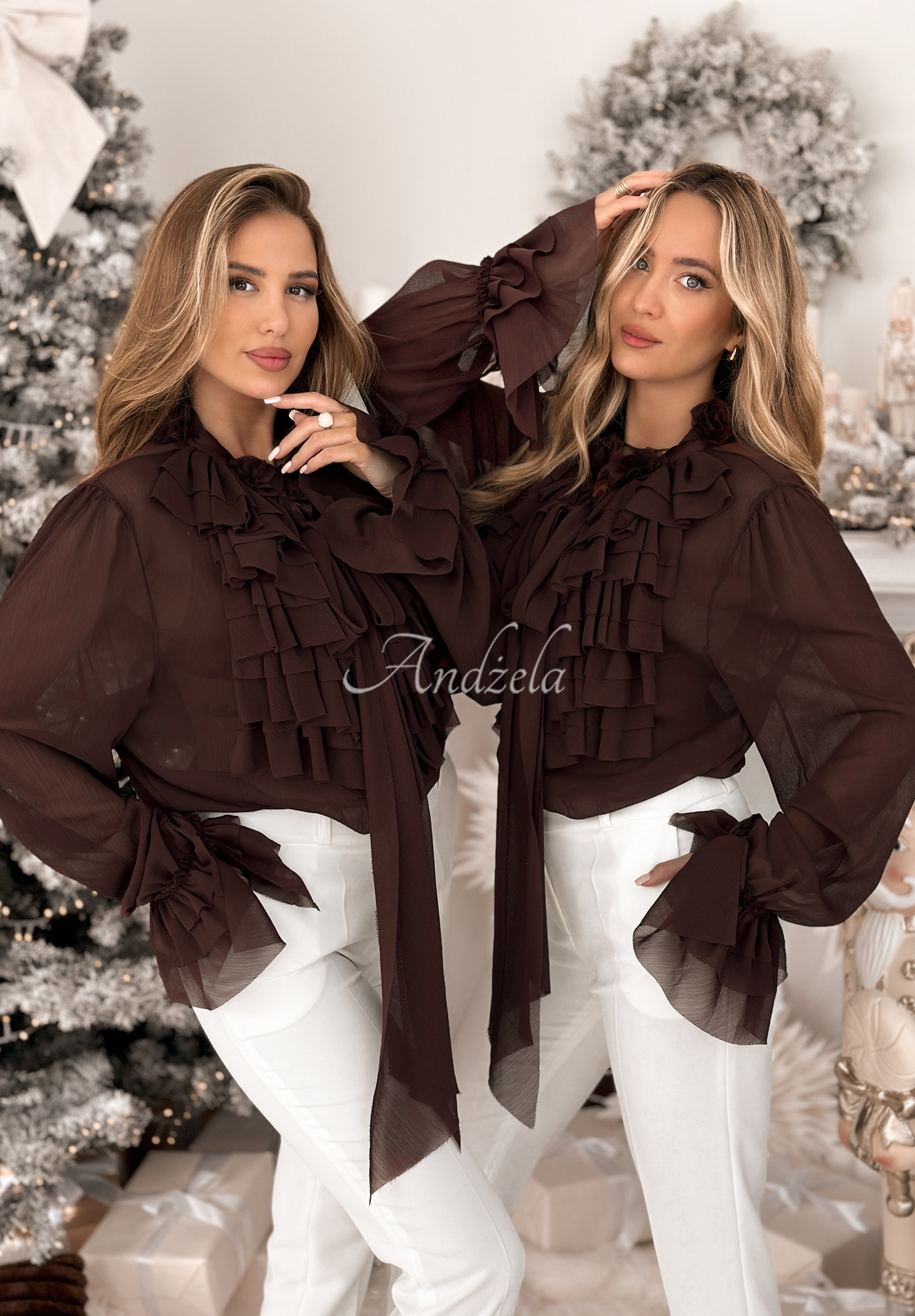 [title] => Elegancka czekoladowa koszula 𝐌𝐢𝐬𝐬 𝐃𝐞𝐥𝐢𝐜𝐚𝐜𝐲 z żabotem i wiązaniem 🤎 Robi cały look! ✨