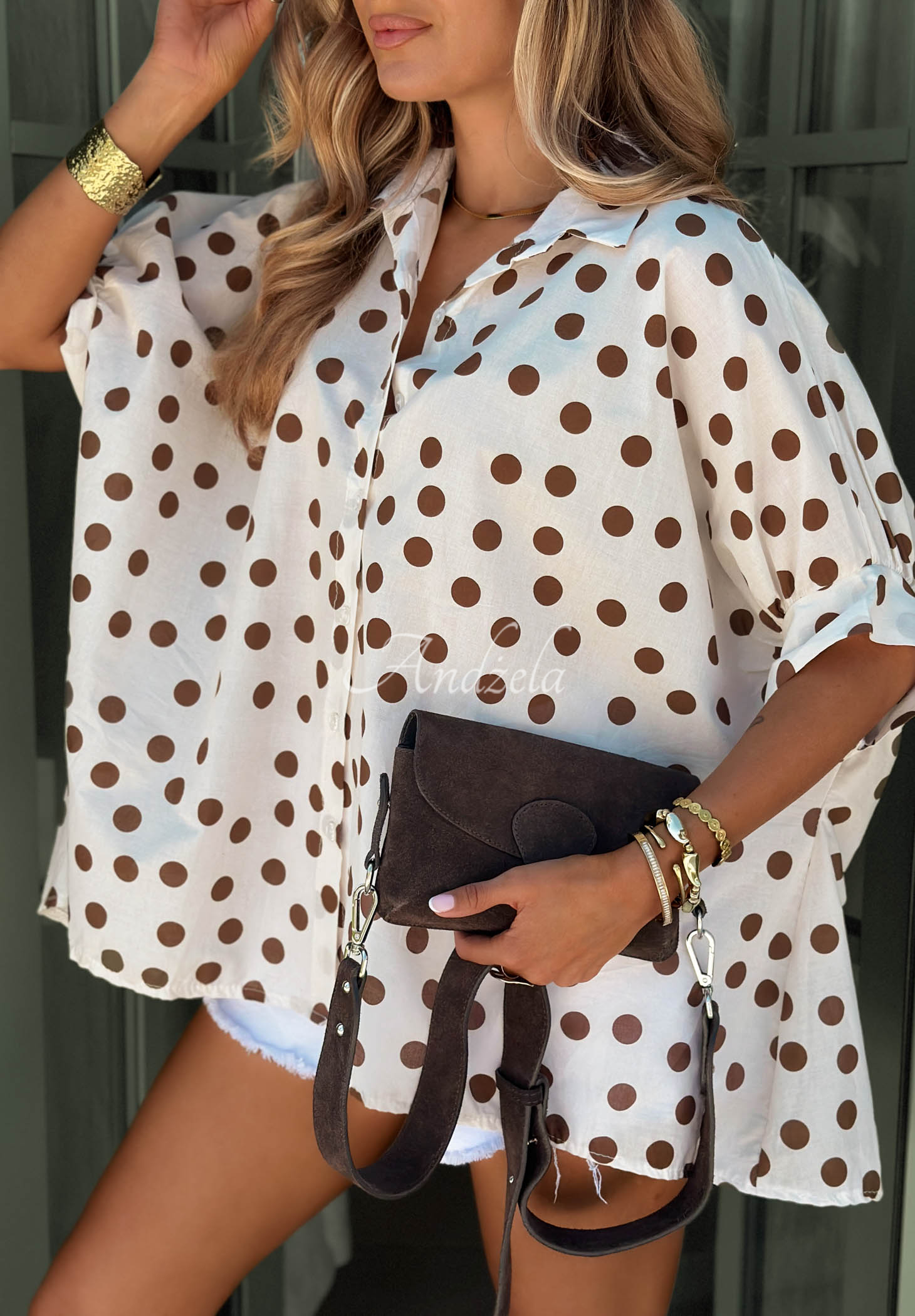 Lehká puntíkovaná košile vyrobená z bavlněného materiálu. Jedná se o oversize model s prodlouženým zadním dílem. Zapíná se na řadu knoflíků, má krátké rukávy se širokými manžetami a límeček.