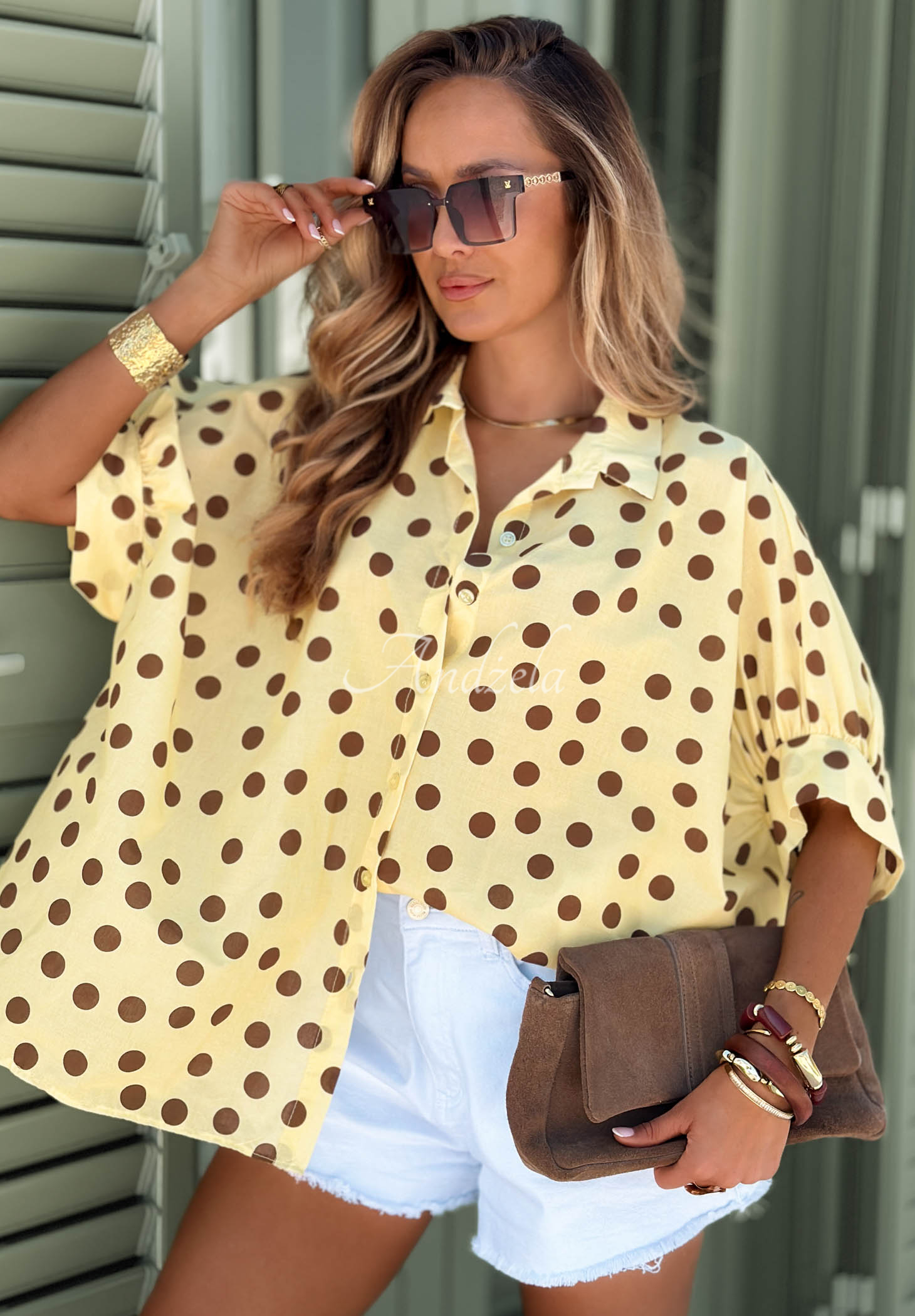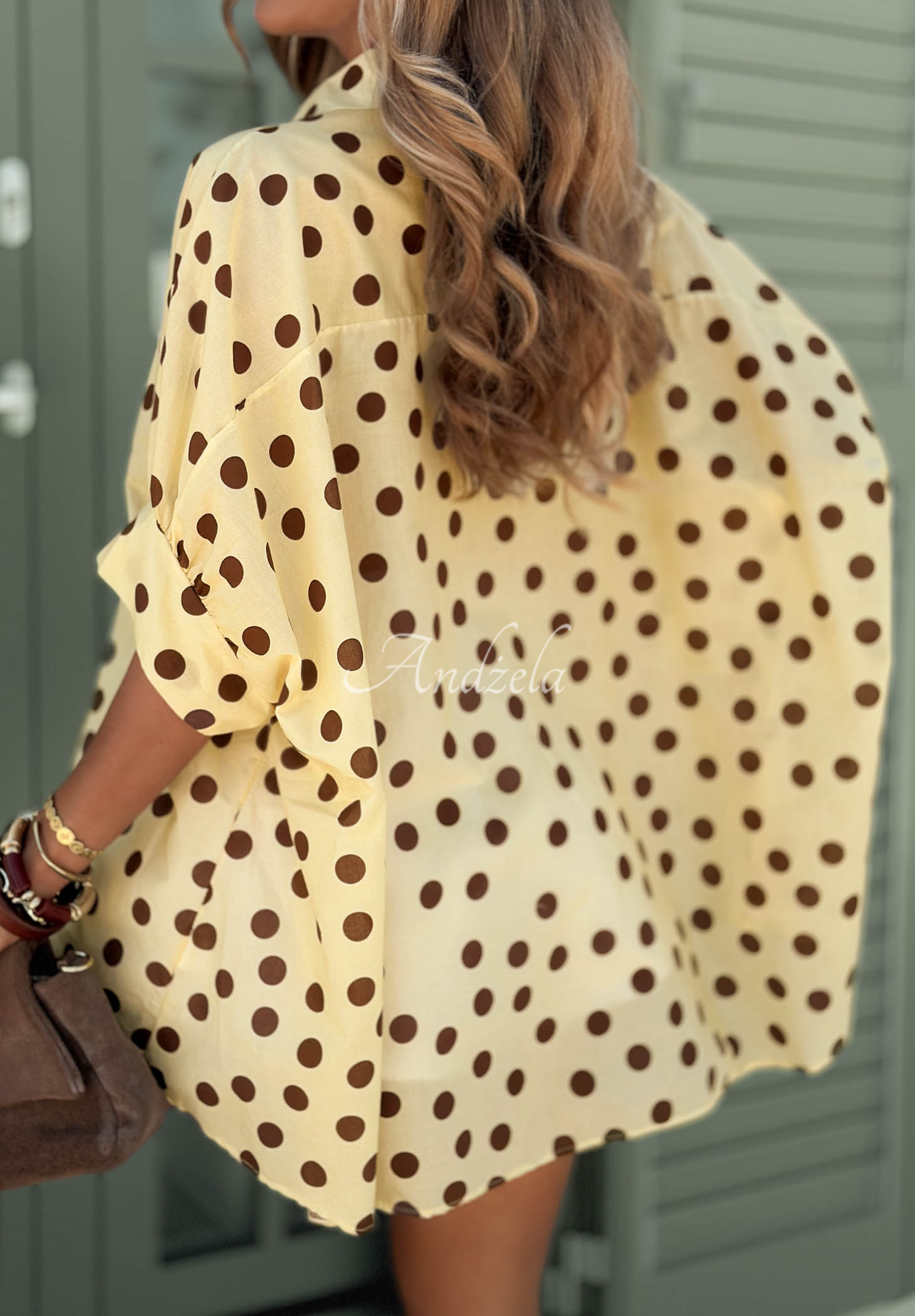 Lehká puntíkovaná košile vyrobená z bavlněného materiálu. Jedná se o oversize model s prodlouženým zadním dílem. Zapíná se na řadu knoflíků, má krátké rukávy se širokými manžetami a límeček.