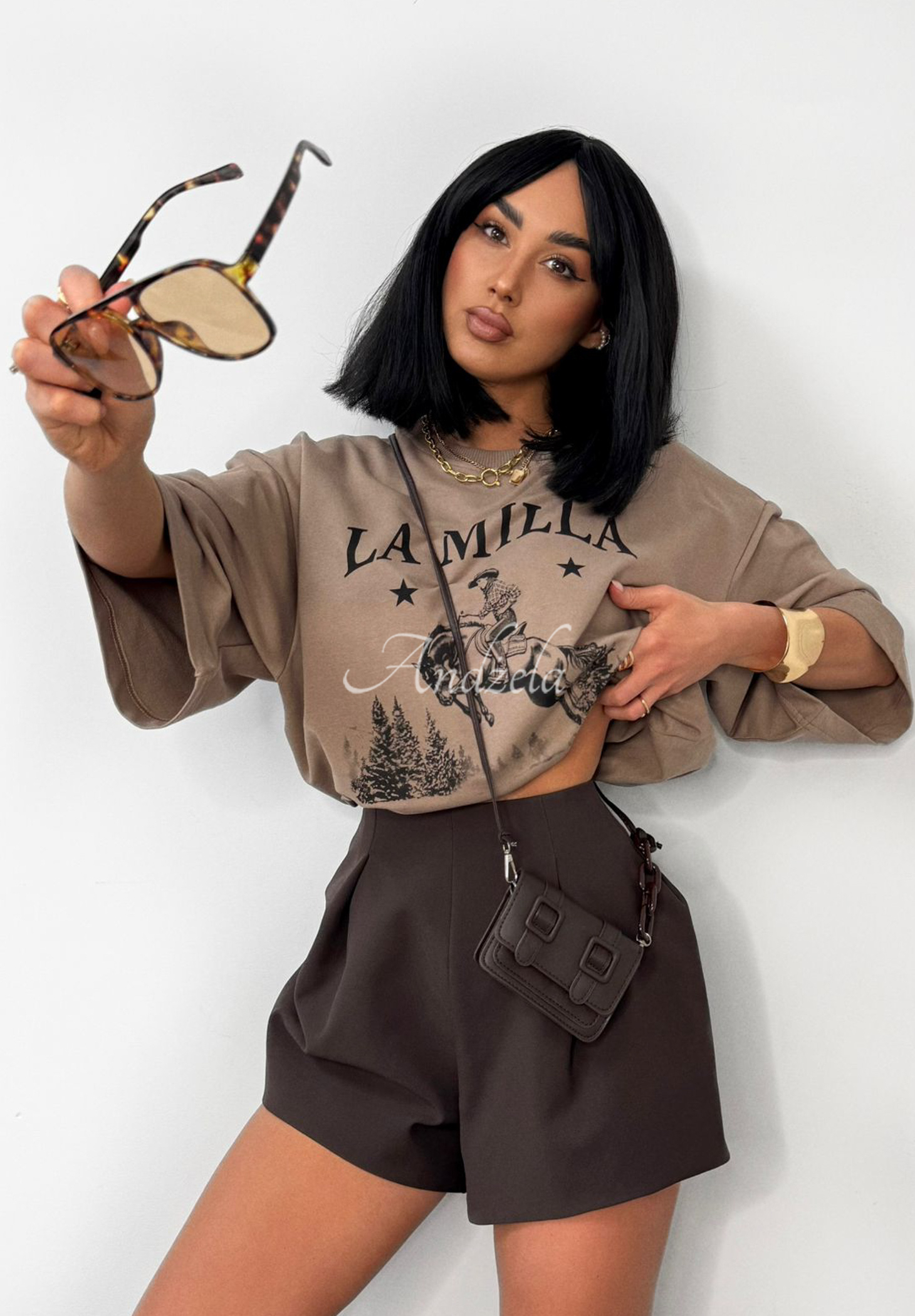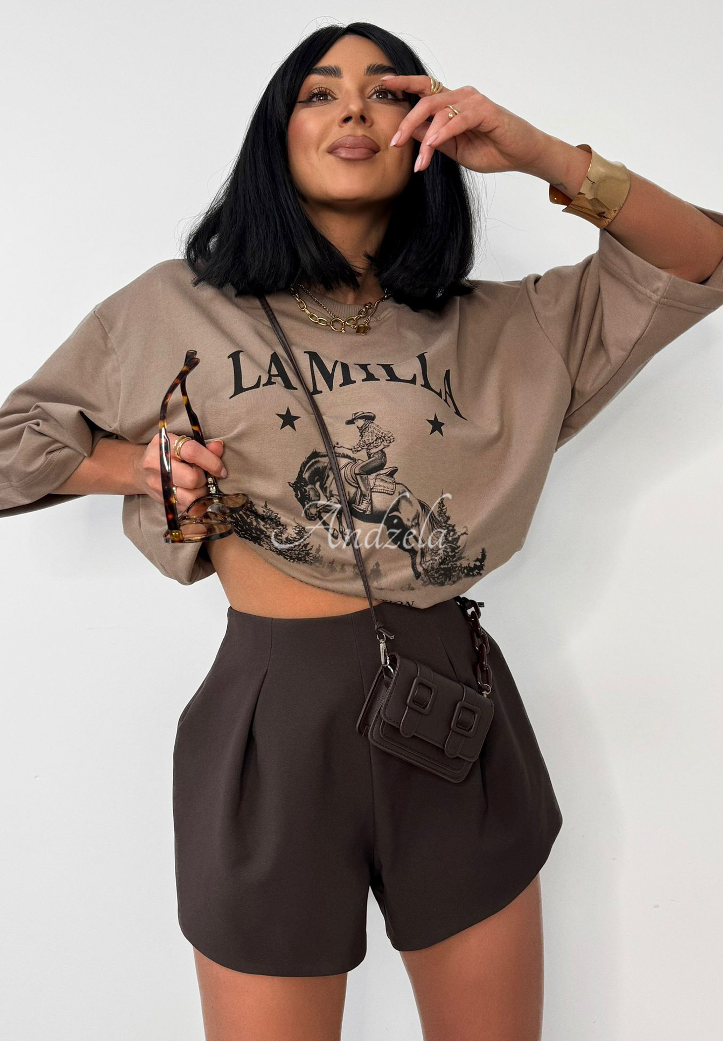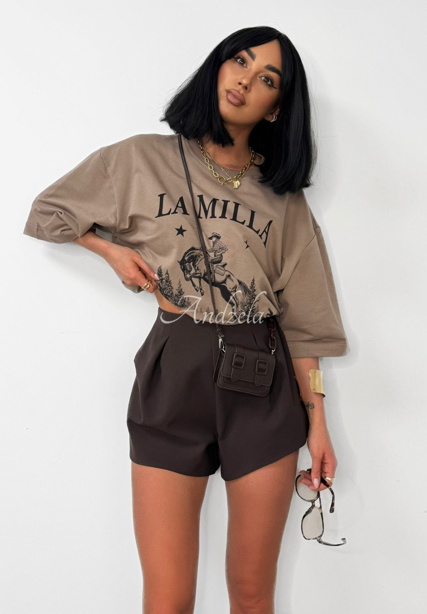 Krátké šortky z vysoce kvalitní viskózové tkaniny. Model se zapínáním na zip vzadu a zvýšeným pasem. Vyznačuje se svislým prošíváním.